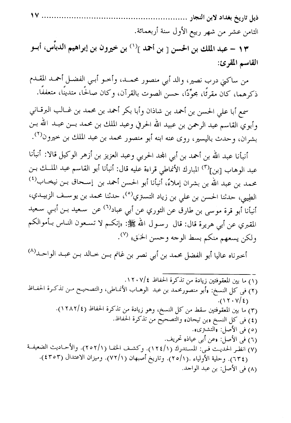 الْبَاقِي بْنِ مُنَازِلٍ الشَّيْبَانِيُّ وَأَبُو يُوسُفَ بْنُ المبارك بن كامل الخفاف، أنبأنا أَبُو مُحَمَّدٍ الْمُبَارَكُ بْنُ أَحْمَدَ بْنِ بَرَكَةَ الكندي قالا: أنبأنا أَبُو الْحُسَيْنِ عَاصِمُ [1] بْنُ الْحَسَنِ بْنِ عَاصِمٍ.