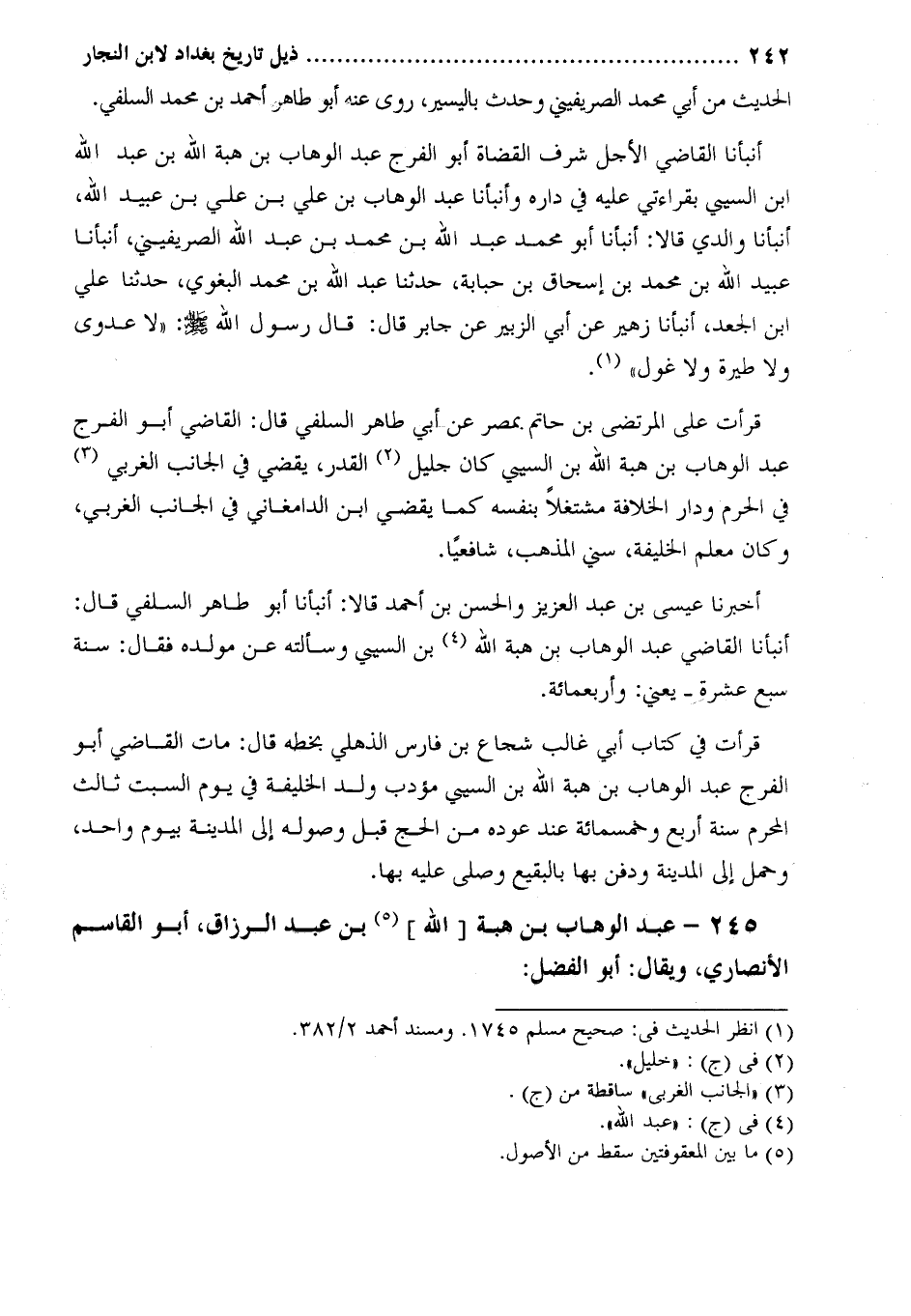 أخبرنا سليمان وعلي ابنا محمد بن علي البغدادي قالا: أنبأنا عمر بن أحمد بن منصور النيسابوري، أنبأنا أبو الحسن علي بن عبد الله بن أبي صادق الحيري، أنبأنا أبو عبد الله محمد بن عبد الله بن باكويه الشيرازي قال: سمعت محمد بن الفرخان يقول: سمعت خالي عبد الوهاب يقول: كنت جالسا عند الجنيد وَكَانَ أيام الموسم، وعليه من أصحاب الموقعات [2] خلق كثير عجم ومولدون، فجاء رجل وسلم عليه وقال: هذا خمسمائة دينار تفرقه على أصحابك. وتركها بين يديه، فقال له الجنيد:
