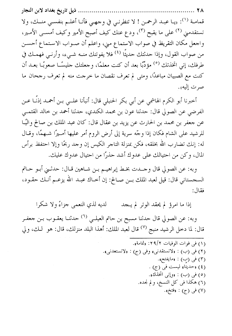 كتب إلى أبو محمد القاسم بن علي بن الحسن الشافعي قال: قرئ علي أبى الوفا حفاظ بن الحسن بن الحسين بن عبد العزيز بن أحمد قال: أنبأنا عبد الوهاب الميداني، أنبأنا أبو سليمان بن زيد، أنبأنا عبد الله بن أحمد بن جعفر، أنبأنا محمد بن جرير الطبري قال: ذكر أحمد [بن إبراهيم] [5] بن إسماعيل أن [6] عبد الملك بن صالح كان له ابن يقال له عبد الرحمن كان من رجال الناس، وكان عبد الملك يكنى به، وكان لابنه عبد الرحمن لسان على فأفأة [7] فيه فنصب [8] لأبيه [9] عبد الملك وقمامة، فسعيا به إلى الرشيد وقالا له إنه يطلب الخلافة ويطمع فيها، فأخذه وحبسه عند الفضل بن الربيع، وقال الرشيد: أما والله لولا الإبقاء [10] على بني هاشم لضربت عنقك. فلم يزل محبوسًا حتى توفي الرشيد، فأطلقه محمد، وعقد له محمد على