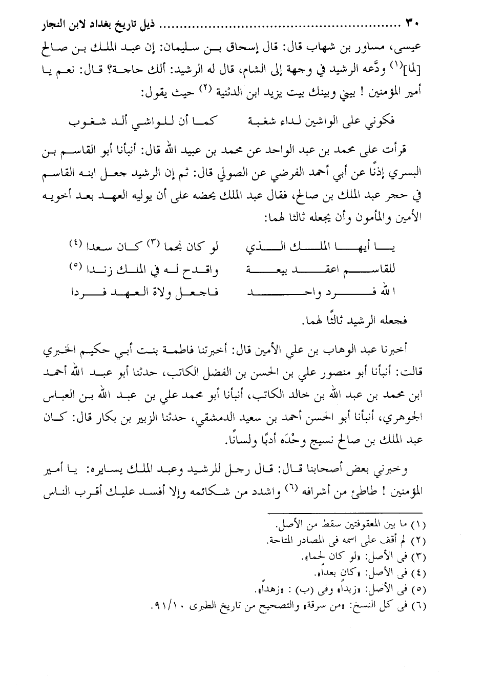 أنبأنا ذاكر بن كامل بن أبي غالب الخفاف قال: كتب إلي الشريف أبو القاسم علي بن إبراهيم الحسيني أن رشأ بن نظيف أخبره قال: أنبأنا أبو الفتح إبراهيم بن علي ابن إبراهيم، أنبأنا أبو بكر محمد بن يحيى الصولي قَالَ: حدثني حسين بن فهم، حدثنا محمد بن أيوب المنشي عن أبيه قال: قال إبراهيم بن المهدي سمعت عبد الملك بن صالح بعد إخراج المخلوع له من حبس الرشيد وقد ذكر ظلم الرشيد إياه وحبسه له على