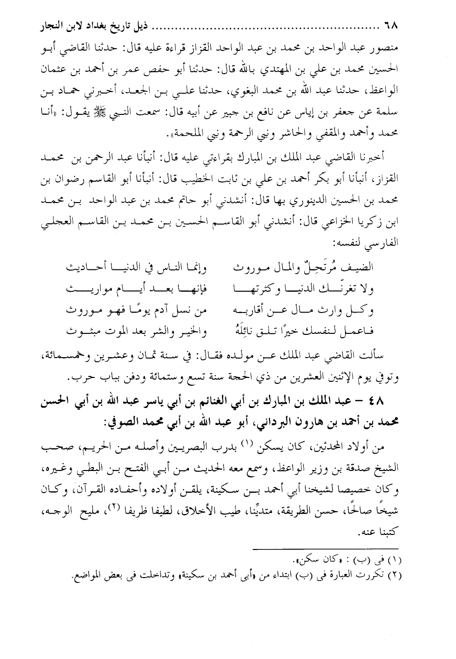 حَدَّثَنَا عَبْدُ الْعَزِيزِ عَنْ أَبِي نَصْرِ بْنِ الأَخْضَرِ مِنْ لَفْظِهِ غَيْرَ مرة قال: أنبأنا عبد الملك ابن محمد أبو الكرم اليعقوبي، حدثنا أَبُو الْغَنَائِمِ مُحَمَّدُ بْنُ عَلِيِّ بْنِ مَيْمُونٍ الكوفي الحافظ وأنبأنا ضياء بن أحمد بن أبي علي بن الْخَرِيفِ وَعَبْدُ اللَّهِ بْنُ ذُهَيْلِ بْنِ عَلِيٍّ قَالا: أَنْبَأَنَا مُحَمَّدُ بْنُ [5] عَبْدِ الْبَاقِي الشَّاهِدُ قالا: حدثنا أبو محمد الحسن بن الحسن بن