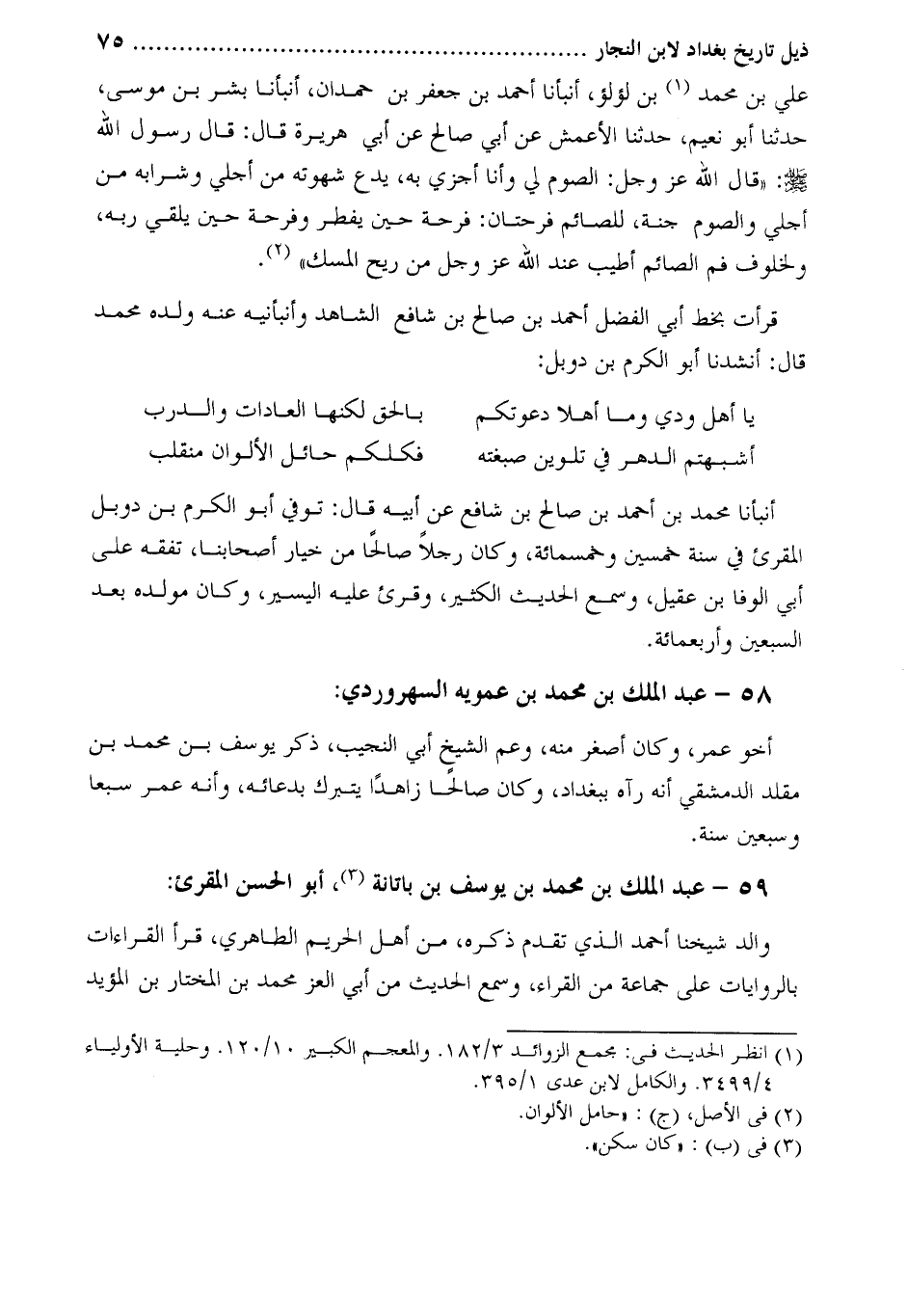 أخبرني إسماعيل بن سليمان العسكري بدمشق قال: أنبأنا عبد الخالق بن أسد بن ثابت الحنفي قال: سمعت عبد الملك بن أبي نصر بن عمر الجيلي أبا المعالي من أهل جيلان ببغداد يقول: سمعت إمام الحرمين أبا مخلد الفزاري قال: كنت بمكة فرأيت شيخا من أهل العرب يطوف ويقول: