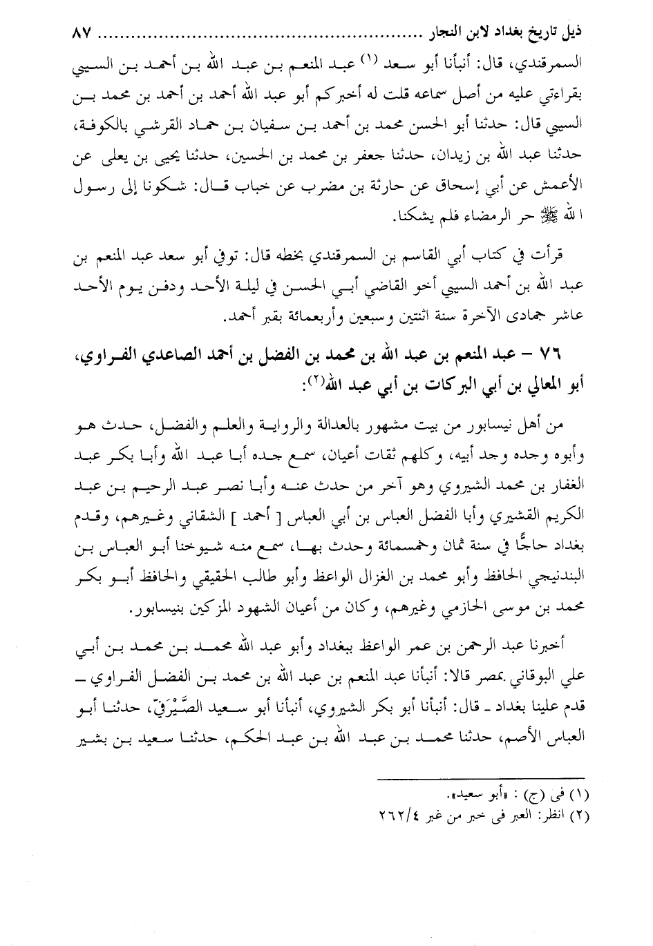 80- عَبْد المنعم بْن عَبْد الوهاب بْن سعد بْن صدقة بْن الخضر [1] بْن كليب الحراني، أبو الفرج بن أبي الفتح التاجر [2] :