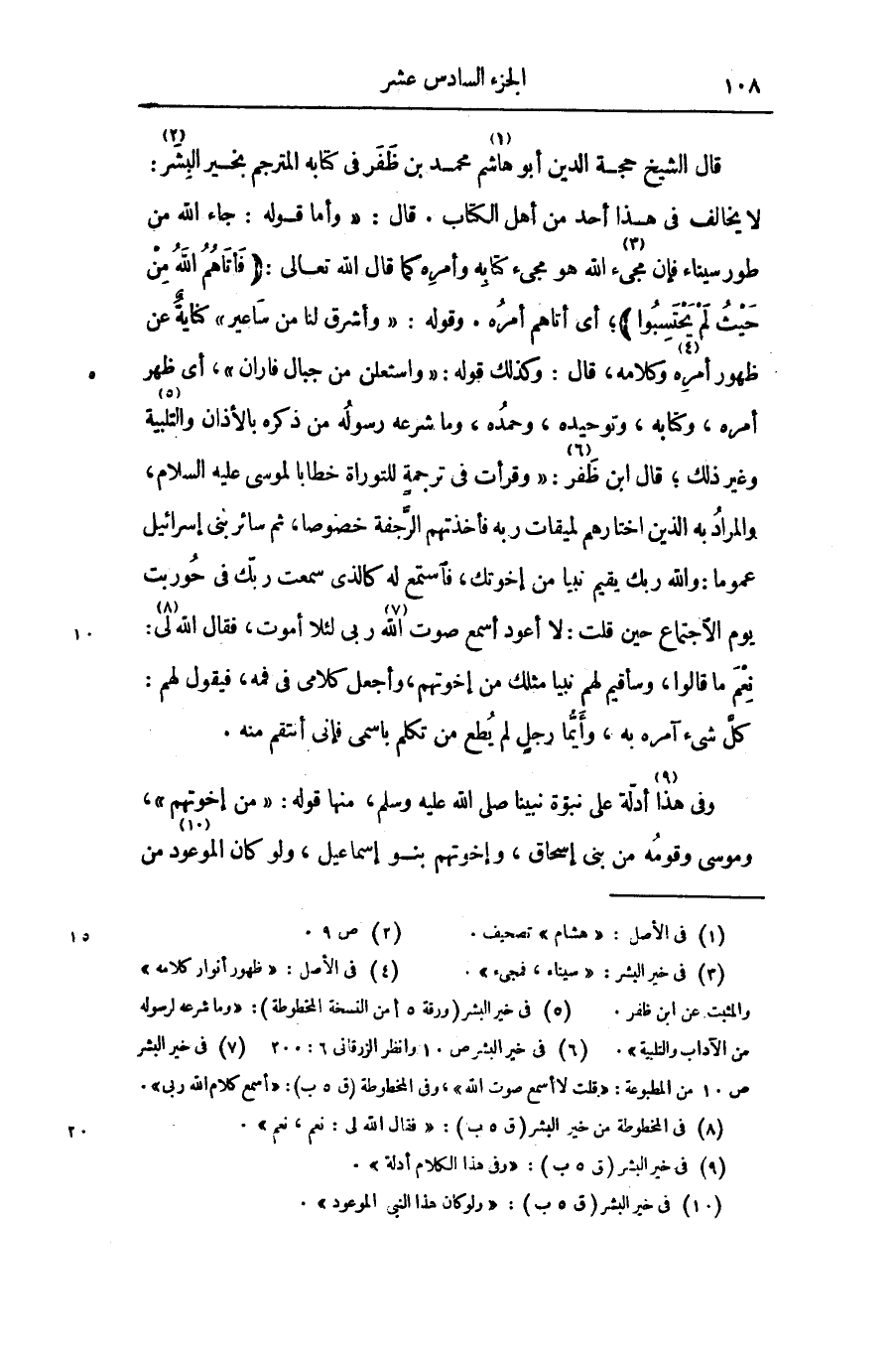 ؛ أى أتاهم أمره. وقوله: «وأشرق لنا من ساعير» كناية عن ظهور أمره «4» وكلامه، قال: وكذلك قوله: «واستعلن من جبال فاران» ، أى ظهر أمره، وكتابه، وتوحيده، وحمده، وما شرعه رسوله من ذكره بالأذان والتلبية «5» وغير ذلك؛ قال ابن ظفر «6» : «وقرأت فى ترجمة للتوراة خطابا لموسى عليه السلام، والمراد به الذين اختارهم لميقات ربه فأخذتهم الرّجفة خصوصا، ثم سائر بنى إسرائيل عموما: والله ربك يقيم نبيا من إخوتك، فاستمع له كالذى سمعت ربّك فى حوربت يوم الاجتماع حين قلت: لا أعود أسمع صوت الله «7» ربى لئلا أموت، فقال الله لى «8» :