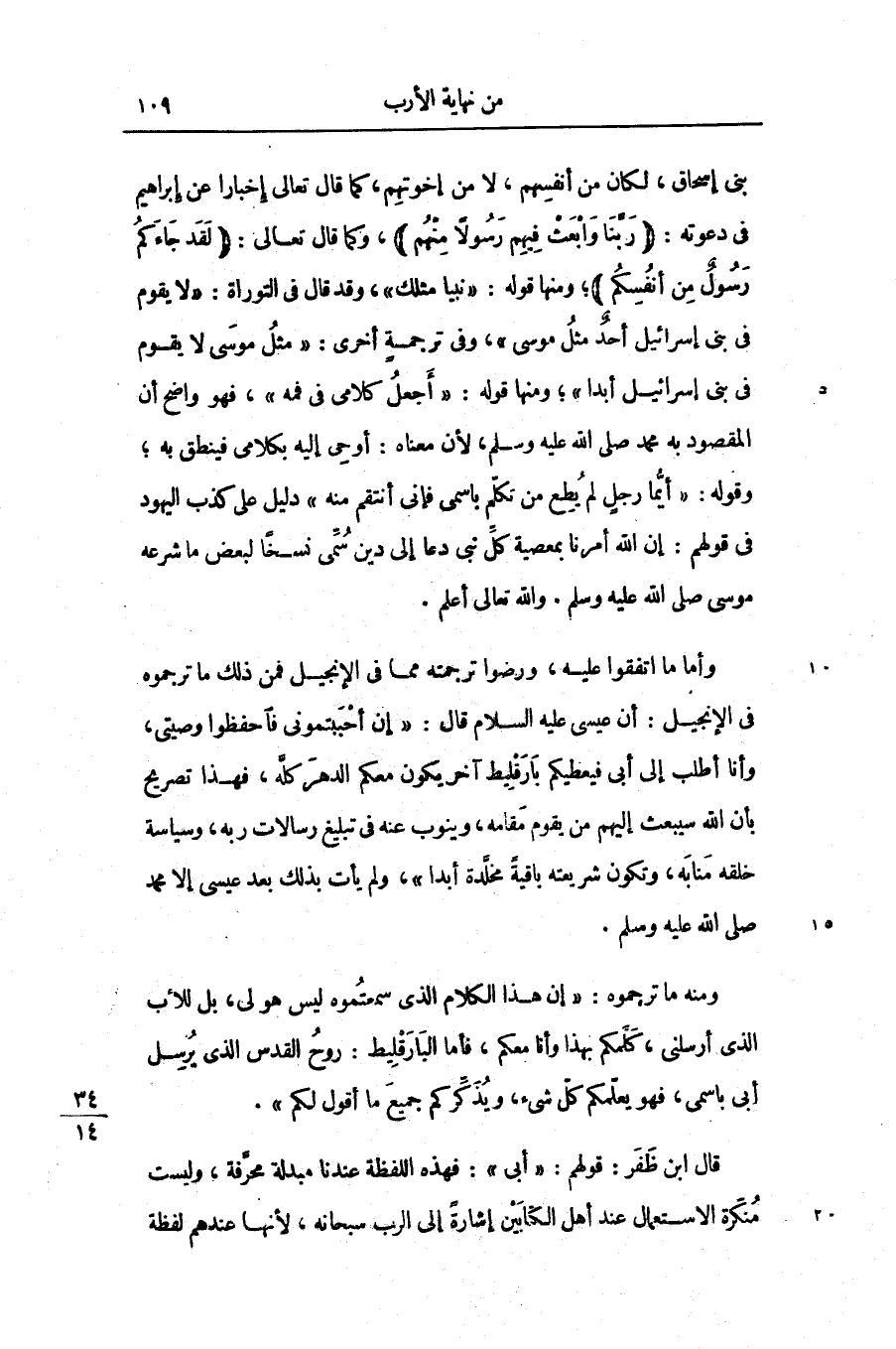 فمن ذلك ما ترجموه فى الإنجيل: أن عيسى عليه السلام قال: «إن أحببتمونى فاحفظوا وصيتى، وأنا أطلب إلى أبى فيعطيكم بارقليط آخر يكون معكم الدهر كلّه، فهذا تصريح بأن الله سيبعث إليهم من يقوم مقامه، وينوب عنه فى تبليغ رسالات ربه، وسياسة خلقه منابه، وتكون شريعته باقية مخلّدة أبدا» ، ولم يأت بذلك بعد عيسى إلا محمد صلى الله عليه وسلم.