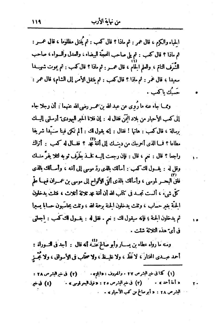 ومما جاء عنه ما روى عن عبد الله بن عمر رضى الله عنهما: أن رجلا جاء إلى كعب الأحبار من بلاد اليمن فقال له: إن فلانا الحبر اليهودىّ أرسلنى إليك برسالة، قال كعب: هاتها! فقال: إنه يقول لك: ألم تكن فينا سيّدا شريفا مطاعا؟ فما الذى أخرجك من دينك إلى أمّة «2» محمد؟ فقال له كعب: أتراك راجعا؟ قال: نعم، قال: فإن رجعت إليه فخذ بطرف ثوبه لئلا يفرّ منك وقل له: يقول لك كعب: أسألك بالذى ردّ موسى إلى أمّه، وأسألك بالذى فلق «3» البحر لموسى، وأسألك بالذى ألقى الألواح إلى موسى بن عمران فيها علم كلّ شىء، ألست تجد فى كتاب الله أن أمّة محمد ثلاثة أثلاث، فثلث يدخلون الجنّة بغير حساب، وثلث يدخلون الجنة برحمة الله، وثلث يحاسبون حسابا يسيرا ثم يدخلون الجنة؛ فإنه سيقول لك: نعم. فقل له: يقول لك كعب: اجعلنى فى أىّ هذه الثلاثة شئت.