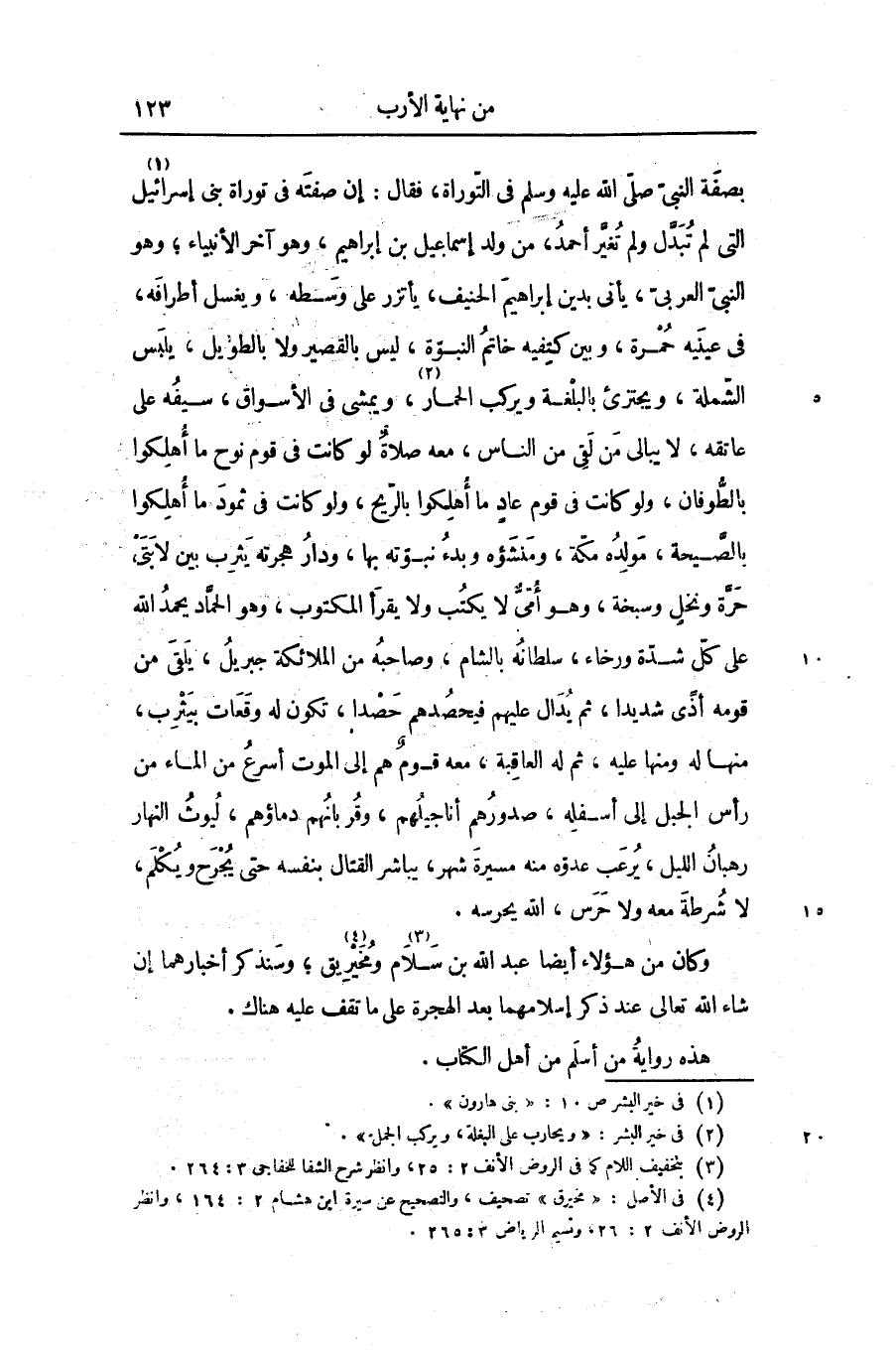 بصفة النبىّ صلّى الله عليه وسلم فى التّوراة فقال: إن صفته فى توراة بنى إسرائيل «1» التى لم تبدّل ولم تغيّر أحمد، من ولد إسماعيل بن إبراهيم، وهو آخر الأنبياء؛ وهو النبىّ العربىّ، يأتى بدين إبراهيم الحنيف، يأتزر على وسطه، ويغسل أطرافه، فى عينيه حمرة، وبين كتفيه خاتم النبوّة، ليس بالقصير ولا بالطويل، يلبس الشّملة، ويجتزئ بالبلغة ويركب الحمار «2» ، ويمشى فى الأسواق، سيفه على عاتقه، لا يبالى من لقى من الناس، معه صلاة لو كانت فى قوم نوح ما أهلكوا بالطّوفان، ولو كانت فى قوم عاد ما أهلكوا بالرّيح، ولو كانت فى ثمود ما أهلكوا بالصّيحة، مولده مكّة، ومنشؤه وبدء نبوّته بها، ودار هجرته يثرب بين لابتى حرّة ونخل وسبخة، وهو أمّىّ لا يكتب ولا يقرأ المكتوب، وهو الحمّاد يحمد الله على كلّ شدّة ورخاء، سلطانه بالشام، وصاحبه من الملائكة جبريل، يلقى من قومه أذى شديدا، ثم يدال عليهم فيحصدهم حصدا، تكون له وقعات بيثرب، منها له ومنها عليه، ثم له العاقبة، معه قوم هم إلى الموت أسرع من الماء من رأس الجبل إلى أسفله، صدورهم أناجيلهم، وقربانهم دماؤهم، ليوث النهار رهبان الليل، يرعب عدوّه منه مسيرة شهر، يباشر القتال بنفسه حتى يجرح ويكلم، لا شرطة معه ولا حرس، الله يحرسه.