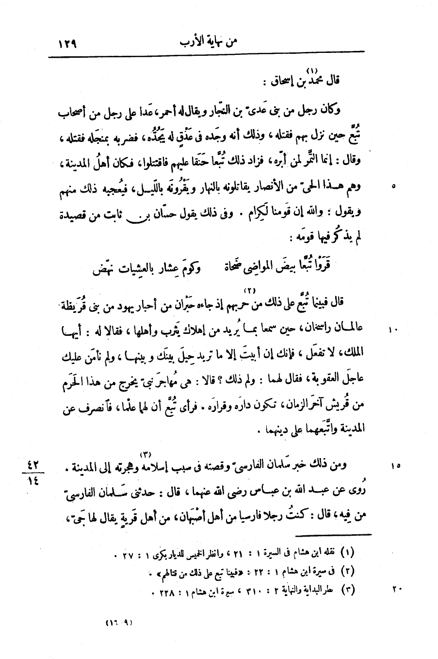 وكان رجل من بنى عدىّ بن النجّار ويقال له أحمر، عدا على رجل من أصحاب تبّع حين نزل بهم فقتله، وذلك أنه وجده فى عذق له يجدّه، فضربه بمنجله فقتله، وقال: إنما التّمر لمن أبّره، فزاد ذلك تبّعا حنقا عليهم فاقتتلوا، فكان أهل المدينة، وهم هذا الحىّ من الأنصار يقاتلونه بالنهار ويقرونه باللّيل، فيعجبه ذلك منهم ويقول: والله إن قومنا لكرام. وفى ذلك يقول حسّان بن ثابت من قصيدة لم يذكر فيها قومه: