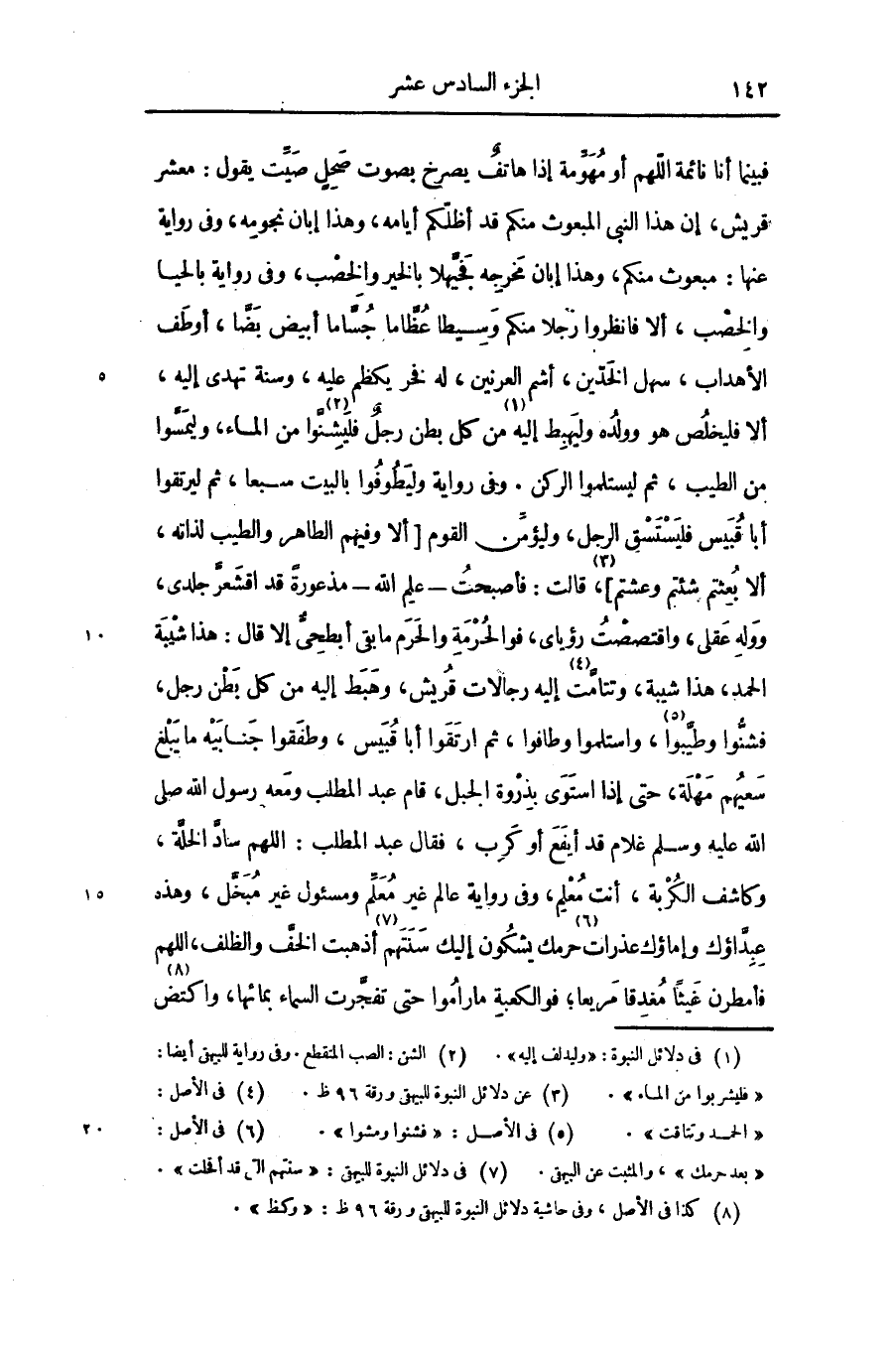 فبينما أنا نائمة اللهم أو مهوّمة إذا هاتف يصرخ بصوت صحل صيّت يقول: معشر قريش، إن هذا النبى المبعوث منكم قد أظلّكم أيامه، وهذا إبان نجومه، وفى رواية عنها: مبعوث منكم، وهذا إبان مخرجه فحيّهلا بالخير والخصب، وفى رواية بالحيا والخصب، ألا فانظروا رجلا منكم وسيطا عظّاما جسّاما أبيض بضّا، أوطف الأهداب، سهل الخدّين، أشم العرنين، له فخر يكظم عليه، وسنة تهدى إليه، ألا فليخلص هو وولده وليهبط إليه «1» من كل بطن رجل فليشنّوا «2» من الماء، وليمسّوا من الطيب، ثم ليستلموا الركن. وفى رواية وليطوفوا بالبيت سبعا، ثم ليرتقوا أبا قبيس فليستسق الرجل، وليؤمّن القوم [ألا وفيهم الطاهر والطيب لذاته، ألا بعثتم إذا شئتم وعشتم] «3» ، قالت: فأصبحت- علم الله- مذعورة قد اقشعرّ جلدى، ووله عقلى، واقتصصت رؤياى، فوالحرمة والحرم ما بقى أبطحىّ إلا قال: هذا شيبة الحمد، هذا شيبة، وتتامّت «4» إليه رجالات قريش، وهبط إليه من كل بطن رجل، فشنّوا وطيّبوا «5» ، واستلموا وطافوا، ثم ارتقوا أبا قبيس، وطفقوا جنابيه ما يبلغ سعيهم مهلة، حتى إذا استوى بذروة الجبل، قام عبد المطلب ومعه رسول الله صلى الله عليه وسلم غلام قد أيفع أو كرب، فقال عبد المطلب: اللهم سادّ الخلّة، وكاشف الكربة، أنت معلم، وفى رواية عالم غير معلّم ومسئول غير مبخّل، وهذه عبدّاؤك وإماؤك عذرات «6» حرمك يشكون إليك سنتهم «7» أذهبت الخفّ والظلف، اللهم فأمطرن غيثا مغدقا مريعا؛ فوالكعبة ما راموا حتى تفجّرت السماء بمائها، واكتض «8»