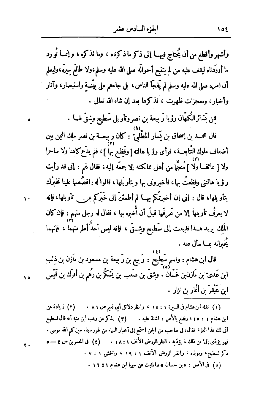 قال محمد بن إسحاق بن يسار المطّلبىّ «1» : كان ربيعة بن نصر ملك اليمن بين أضعاف ملوك التّتابعة، فرأى رؤيا هالته [وفظع بها «2» ] ، فلم يدع كاهنا ولا ساحرا ولا [عائفا ولا «3» ] منجّما من أهل مملكته إلا جمعه إليه، فقال لهم: إنى قد رأيت رؤيا هالتنى وفظعت بها، فأخبرونى بها وبتأويلها، قالوا له: اقصصها علينا نخبرك بتأويلها، قال: إنى إن أخبرتكم بها لم أطمئنّ إلى خبركم عن تأويلها، فإنه لا يعرف تأويلها إلا من عرفها قبل أن أخبره بها، فقال له رجل منهم: فإن كان الملك يريد هذا فليبعث إلى سطيح وشقّ، فإنه ليس أحد أعلم منهما «4» ، فإنهما يخبرانه بما سأل عنه.