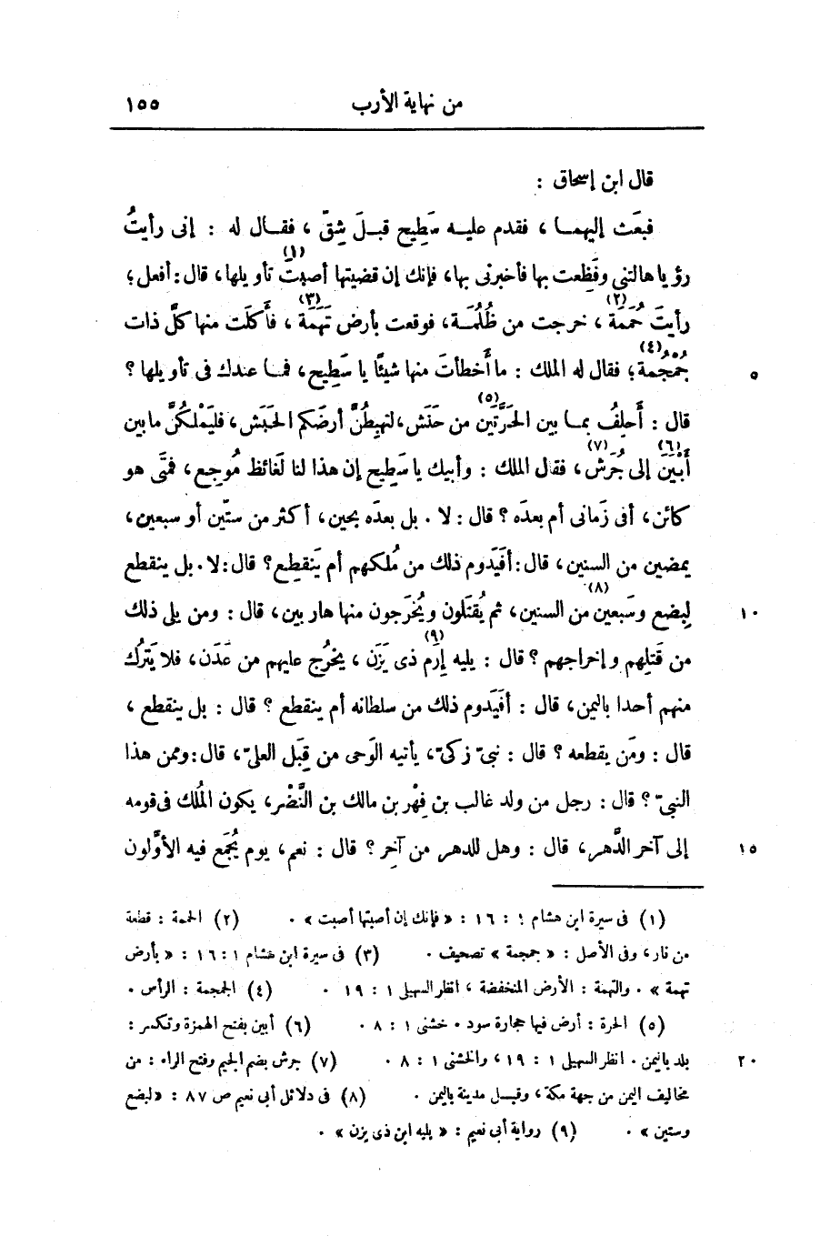 ، فقال الملك: وأبيك يا سطيح إن هذا لنا لغائظ موجع، فمتى هو كائن، أفى زمانى أم بعده؟ قال: لا. بل بعده بحين، أكثر من ستّين أو سبعين، يمضين من السنين، قال: أفيدوم ذلك من ملكهم أم ينقطع؟ قال: لا. بل ينقطع لبضع وسبعين «8» من السنين، ثم يقتلون ويخرجون منها هاربين، قال: ومن يلى ذلك من قتلهم وإخراجهم؟ قال: يليه إرم «9» ذى يزن، يخرج عليهم من عدن، فلا يترك منهم أحدا باليمن، قال: أفيدوم ذلك من سلطانه أم ينقطع؟ قال: بل ينقطع، قال: ومن يقطعه؟ قال: نبىّ زكىّ، يأتيه الوحى من قبل العلىّ، قال: وممن هذا النبىّ؟ قال: رجل من ولد غالب بن فهر بن مالك بن النّضر، يكون الملك فى قومه إلى آخر الدّهر، قال: وهل للدهر من آخر؟ قال: نعم، يوم يجمع فيه الأوّلون