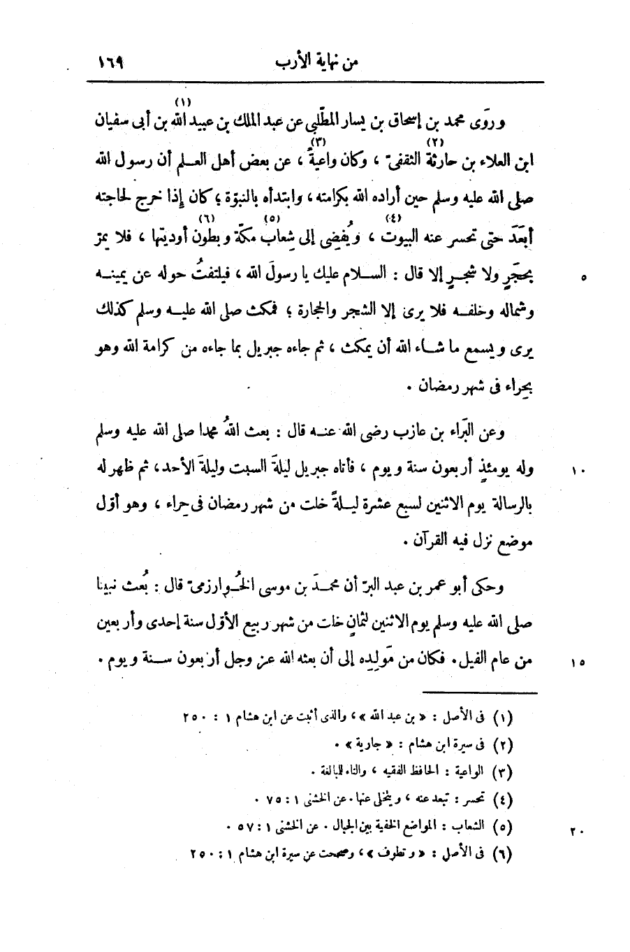 وعن البراء بن عازب رضى الله عنه قال: بعث الله محمدا صلى الله عليه وسلم وله يومئذ أربعون سنة ويوم، فأتاه جبريل ليلة السبت وليلة الأحد، ثم ظهر له بالرسالة يوم الاثنين لسبع عشرة ليلة خلت من شهر رمضان فى حراء، وهو أوّل موضع نزل فيه القرآن.