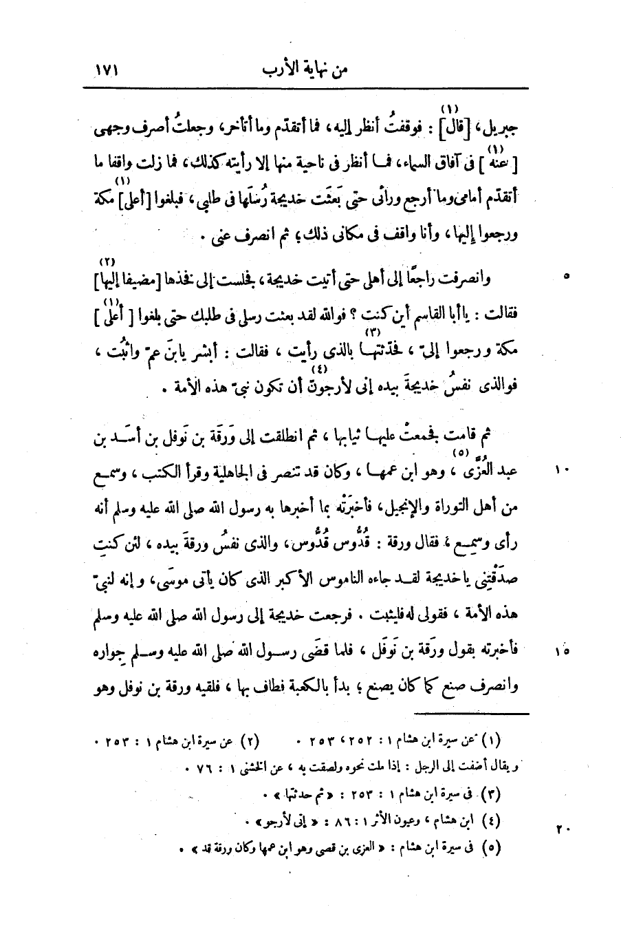 ثم قامت فجمعت عليها ثيابها، ثم انطلقت إلى ورقة بن نوفل بن أسد بن عبد العزّى «8» ، وهو ابن عمها، وكان قد تنصر فى الجاهلية وقرأ الكتب، وسمع من أهل التوراة والإنجيل، فأخبرته بما أخبرها به رسول الله صلى الله عليه وسلم أنه رأى وسمع، فقال ورقة: قدّوس قدّوس، والذى نفس ورقة بيده، لئن كنت صدقتنى يا خديجة لقد جاءه الناموس الأكبر الذى كان يأتى موسى، وإنه لنبىّ هذه الأمة، فقولى له فليثبت. فرجعت خديجة إلى رسول الله صلى الله عليه وسلم فأخبرته بقول ورقة بن نوفل، فلما قضى رسول الله صلى الله عليه وسلم جواره وانصرف صنع كما كان يصنع؛ بدأ بالكعبة فطاف بها، فلقيه ورقة بن نوفل وهو