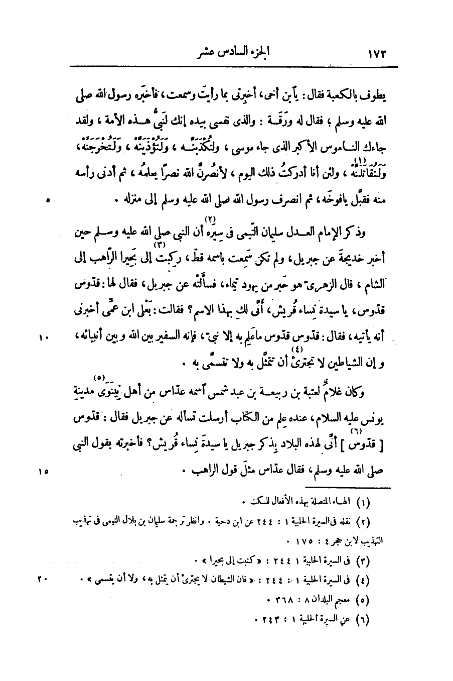وذكر الإمام العدل سليمان التّيمى فى سيره «2» أن النبى صلى الله عليه وسلم حين أخبر خديجة عن جبريل، ولم تكن سمعت باسمه قطّ، ركبت «3» إلى بحيرا الرّاهب إلى الشام، قال الزهرىّ هو حبر من يهود تيماء، فسألته عن جبريل، فقال لها: قدّوس قدّوس، يا سيدة نساء قريش، أنّى لك بهذا الاسم؟ فقالت: بعلى ابن عمّى أخبرنى أنه يأتيه، فقال: قدّوس قدّوس ما علم به إلا نبىّ، فإنه السفير بين الله وبين أنبيائه، وإن الشياطين لا تجترئ «4» أن تتمثّل به ولا تتسمّى به.