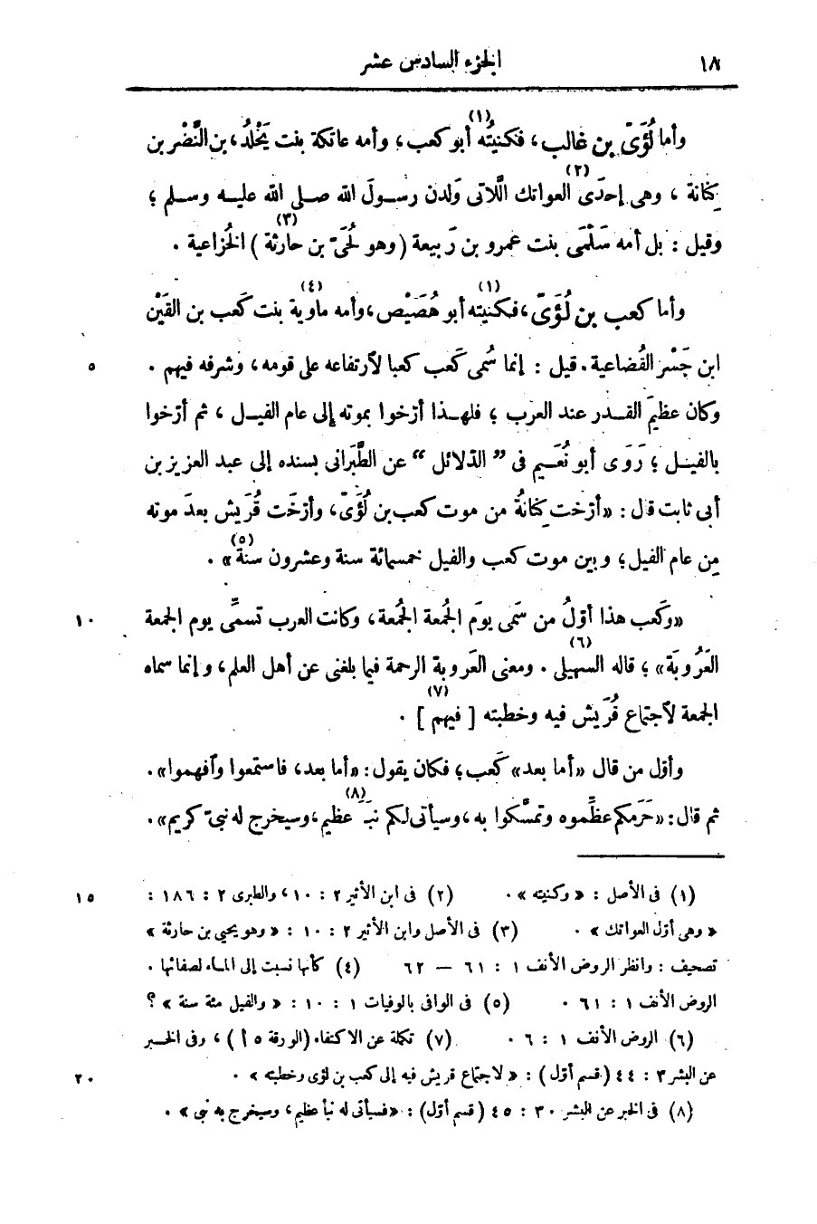 «وكعب هذا أوّل من سمى يوم الجمعة الجمعة، وكانت العرب تسمّى يوم الجمعة العروبة» ؛ قاله السهيلى «7» . ومعنى العروبة الرحمة فيما بلغنى عن أهل العلم، وإنما سماه الجمعة لاجتماع قريش فيه وخطبته [فيهم «8» ] .
