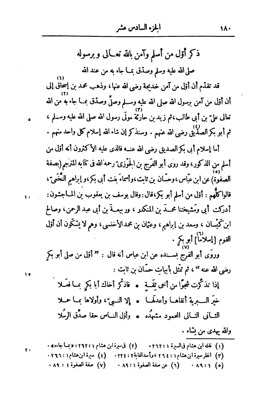 أما إسلام أبى بكر الصديق رضى الله عنه فالذى عليه الأكثرون أنه أوّل من أسلم من الذكور، وقد روى أبو الفرج بن الجوزىّ رحمه الله فى كتابه المترجم (بصفة الصفوة «5» ) عن ابن عبّاس، وحسّان بن ثابت، وأسماء بنت أبى بكر، وإبراهيم النّخعىّ، قالوا كلّهم: أوّل من أسلم أبو بكر، قال: وقال يوسف بن يعقوب بن الماجشون: