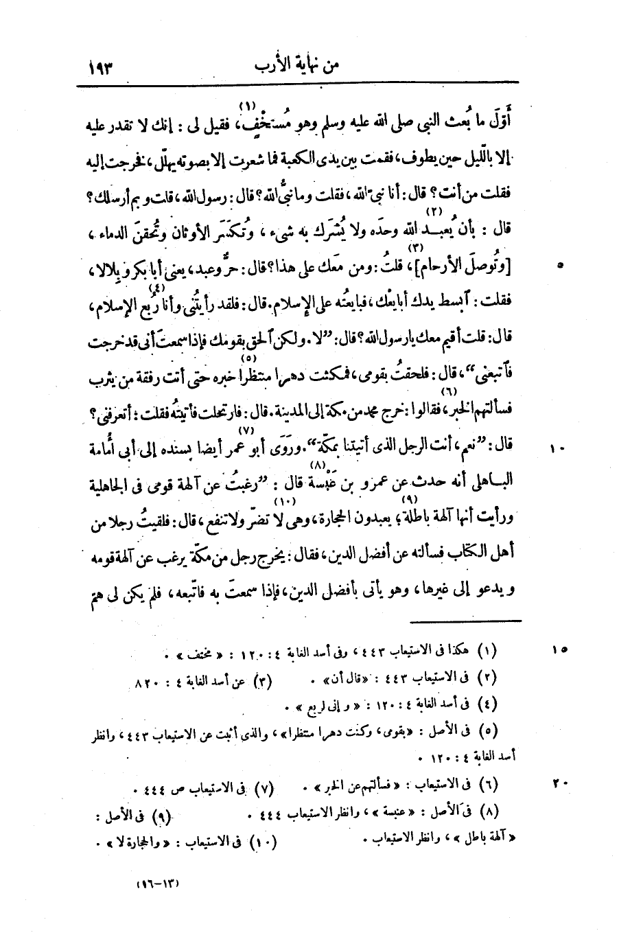 قال: «نعم، أنت الرجل الذى أتيتنا بمكّة» . وروى أبو «7» عمر أيضا بسنده إلى أبى أمامة الباهلى أنه حدث عن عمرو بن عبسة «8» قال: «رغبت عن آلهة قومى فى الجاهلية ورأيت أنها آلهة باطلة «9» ؛ يعبدون الحجارة، وهى لا «10» تضرّ ولا تنفع، قال: فلقيت رجلا من أهل الكتاب فسألته عن أفضل الدين، فقال: يخرج رجل من مكّة يرغب عن آلهة قومه ويدعو إلى غيرها، وهو يأتى بأفضل الدين، فإذا سمعت به فاتّبعه، فلم يكن لى همّ