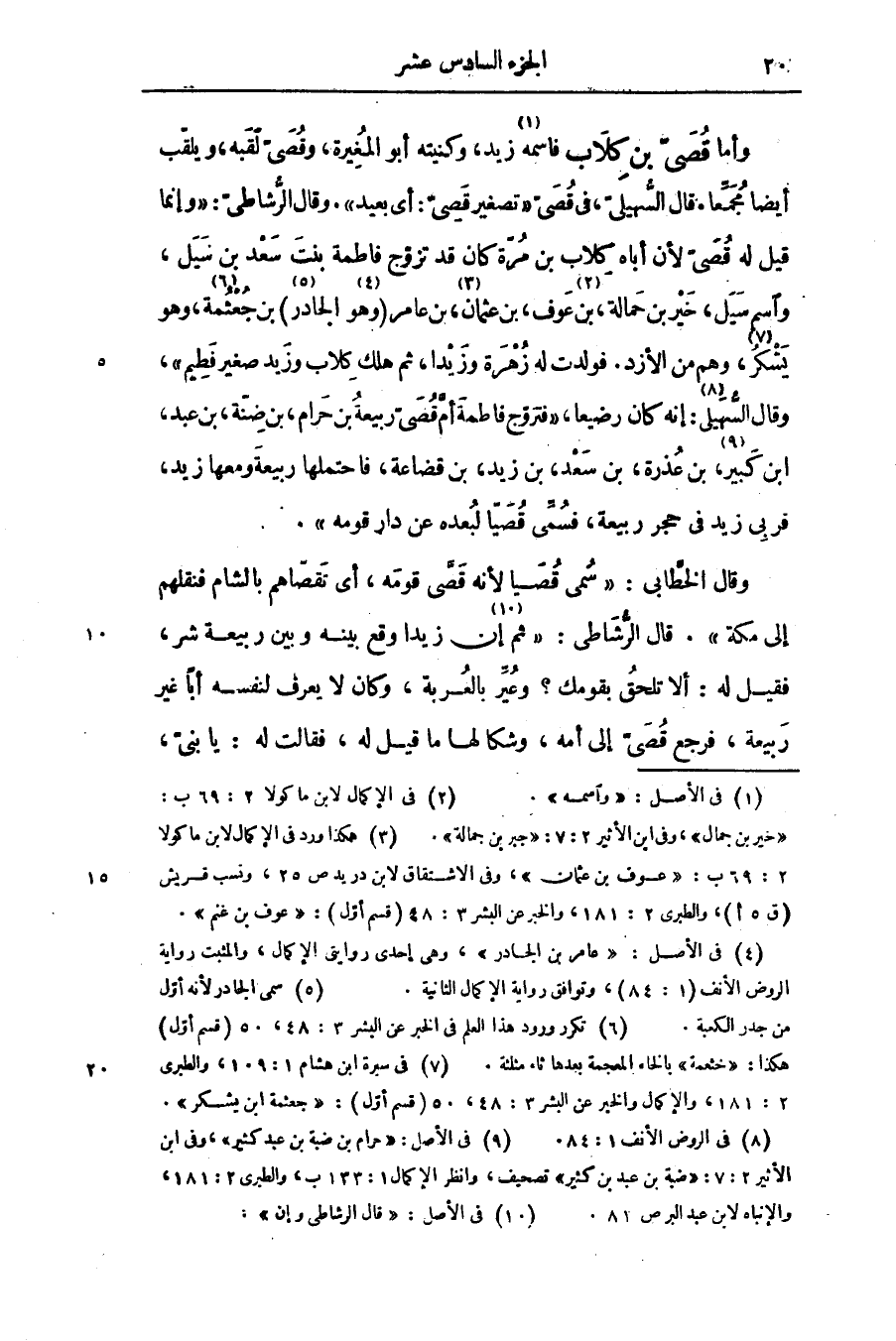فاسمه «1» زيد، وكنيته أبو المغيرة، وقصىّ لقبه، ويلقّب أيضا مجمّعا. قال السّهيلىّ، فى قصىّ «تصغير قصىّ: أى بعيد» . وقال الرّشاطىّ: «وإنما قيل له قصىّ لأن أباه كلاب بن مرّة كان قد تزوّج فاطمة بنت سعد بن سيل، واسم سيل، خير بن حمالة، «2» بن عوف، بن عثمان «3» ، بن عامر (و «4» هو الجادر «5» ) بن جعثمة «6» ، وهو يشكر «7» ، وهم من الأزد. فولدت له زهرة وزيدا، ثم هلك كلاب وزيد صغير فطيم» ، وقال السّهيلى «8» : إنه كان رضيعا، «فتزوّج فاطمة أمّ قضىّ ربيعة بن حرام، بن ضنّة، بن عبد، ابن كبير «9» ، بن عذرة، بن سعد، بن زيد، بن قضاعة، فاحتملها ربيعة ومعها زيد، فربى زيد فى حجر ربيعة، فسمّى قصيّا لبعده عن دار قومه» .