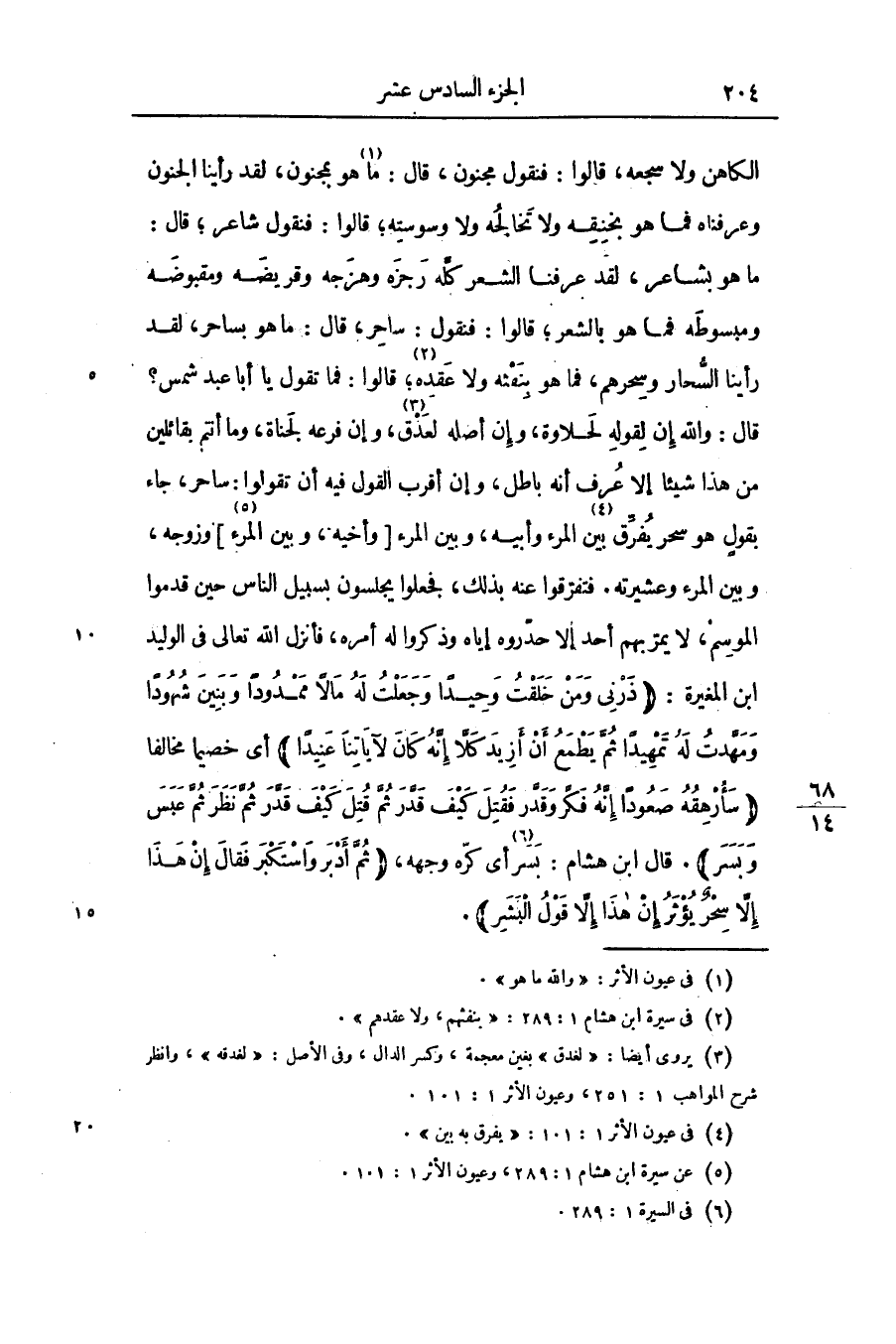 قال: والله إن لقوله لحلاوة، وإن أصله لعدق «3» ، وإن فرعه لجناة، وما أنتم بقائلين من هذا شيئا إلا عرف أنه باطل، وإن أقرب القول فيه أن تقولوا: ساحر، جاء بقول هو سحر يفرّق بين «4» المرء وأبيه، وبين المرء [وأخيه، وبين المرء «5» ] وزوجه، وبين المرء وعشيرته. فتفرّقوا عنه بذلك، فجعلوا يجلسون بسبيل الناس حين قدموا الموسم، لا يمرّبهم أحد إلا حدّروه إياه وذكروا له أمره، فأنزل الله تعالى فى الوليد ابن المغيرة: (ذَرْنِي وَمَنْ خَلَقْتُ وَحِيداً وَجَعَلْتُ لَهُ مالًا مَمْدُوداً وَبَنِينَ شُهُوداً وَمَهَّدْتُ لَهُ تَمْهِيداً ثُمَّ يَطْمَعُ أَنْ أَزِيدَ كَلَّا إِنَّهُ كانَ لِآياتِنا عَنِيداً)