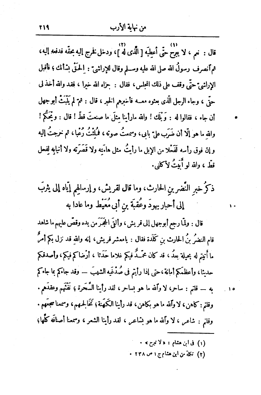 قال: ولمّا رجع أبو جهل إلى قريش، وألقى الحجر من يده وقصّ عليهم ما شاهد قام النضر بن الحارث بن كلدة فقال: يا معشر قريش، إنه والله قد نزل بكم أمر ما أتيتم له بحيلة بعد، قد كان محمّد فيكم غلاما حدثا، أرضاكم فيكم، وأصدقكم حديثا، وأعظمكم أمانة، حتى إذا رأيتم فى صدغيه الشيب- وقد جاءكم بما جاءكم به- قلتم: ساحر، لا والله ما هو بساحر، لقد رأينا السّحرة؛ نفثهم وعقدهم.