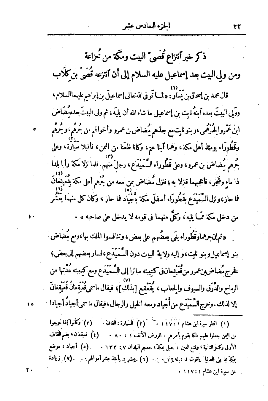 قال محمد بن إسحاق بن يسار «1» : «لما توفى لله تعالى إسماعيل بن إبراهيم عليهما السلام، وولى البيت بعده ابنه نابت بن إسماعيل ما شاء الله أن يليه، ثم ولى البيت بعده مضاض ابن عمرو الجرهمى، وبنو نابت مع جدّهم مضاض بن عمرو وأخوالهم من جرهم، وجرهم وقطوراء يومئذ أهل مكة، وهما ابنا عمّ، وكانا ظعنا من اليمن، فأقبلا سيّارة «2» ، وعلى جرهم مضاض بن عمرو، وعلى قطوراء السّميدع، رجل «3» منهم. فلما نزلا مكة وأبا بلدا ذا ماء وشجر، فأعجبهما فنزلا به؛ فنزل مضاض بمن معه من جرهم أعلى مكة بقعيقعان «4» فما حاز، ونزل السّميدع بقطوراء أسفل مكة بأجياد «5» فما حاز، وكان كل منهما يعشر «6» من دخل مكة ممّا يليه، وكلّ منهما فى قومه لا يدخل على صاحبه» .