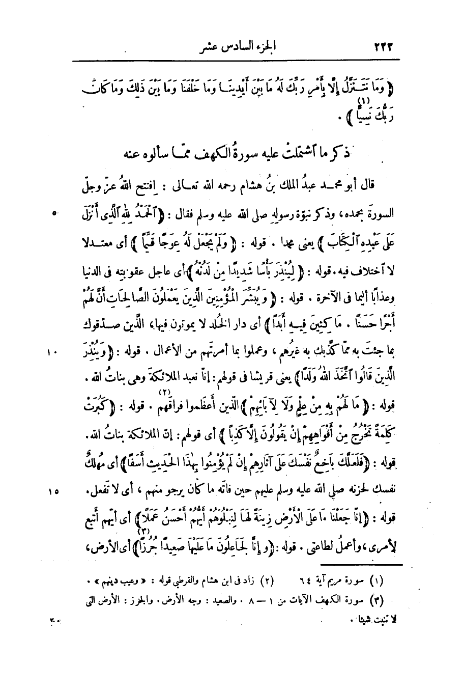 قال أبو محمد عبد الملك بن هشام رحمه الله تعالى: افتتح الله عزّ وجلّ السورة بحمده، وذكر نبوّة رسوله صلى الله عليه وسلم فقال: (الْحَمْدُ لِلَّهِ الَّذِي أَنْزَلَ عَلى عَبْدِهِ الْكِتابَ)
