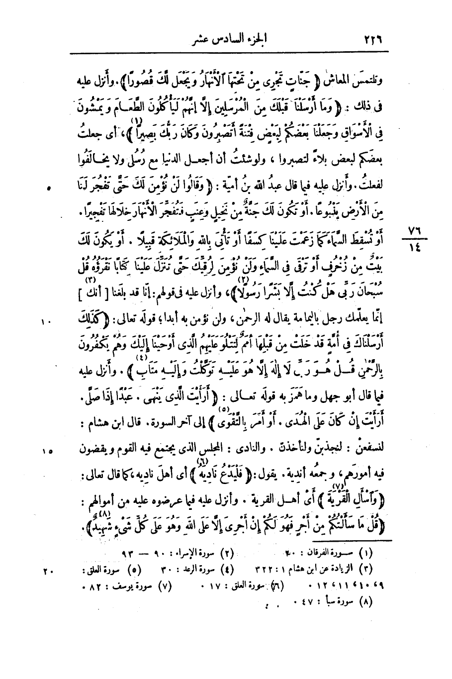 «1» ، أى جعلت بعضكم لبعض بلاء لتصبروا، ولو شئت أن أجعل الدنيا مع رسلى ولا يخالفوا لفعلت. وأنزل عليه فيما قال عبد الله بن أميّة: (وَقالُوا لَنْ نُؤْمِنَ لَكَ حَتَّى تَفْجُرَ لَنا مِنَ الْأَرْضِ يَنْبُوعاً. أَوْ تَكُونَ لَكَ جَنَّةٌ مِنْ نَخِيلٍ وَعِنَبٍ فَتُفَجِّرَ الْأَنْهارَ خِلالَها تَفْجِيراً.