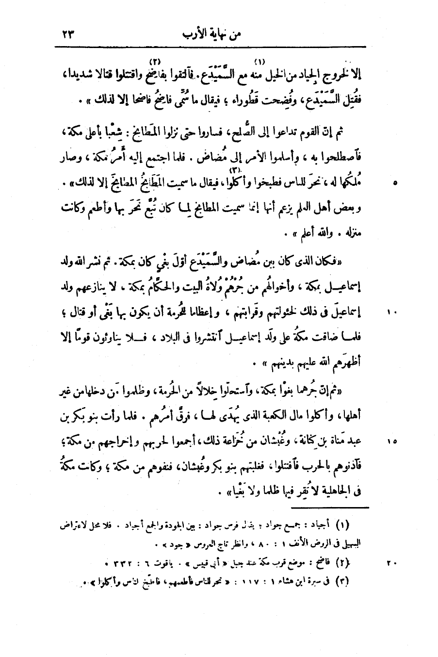 «فكان الذى كان بين مضاض والسّميدع أوّل بغى كان بمكة. ثم نشر الله ولد إسماعيل بمكة، وأخوالهم من جرهم ولاة البيت والحكّام بمكة، لا ينازعهم ولد إسماعيل فى ذلك لخئولتهم وقرابتهم، وإعظاما للحرمة أن يكون بها بغى أو قتال؛ فلما ضاقت مكة على ولد إسماعيل انتشروا فى البلاد، فلا يناوئون قوما إلا أظهرهم الله عليهم بدينهم» .