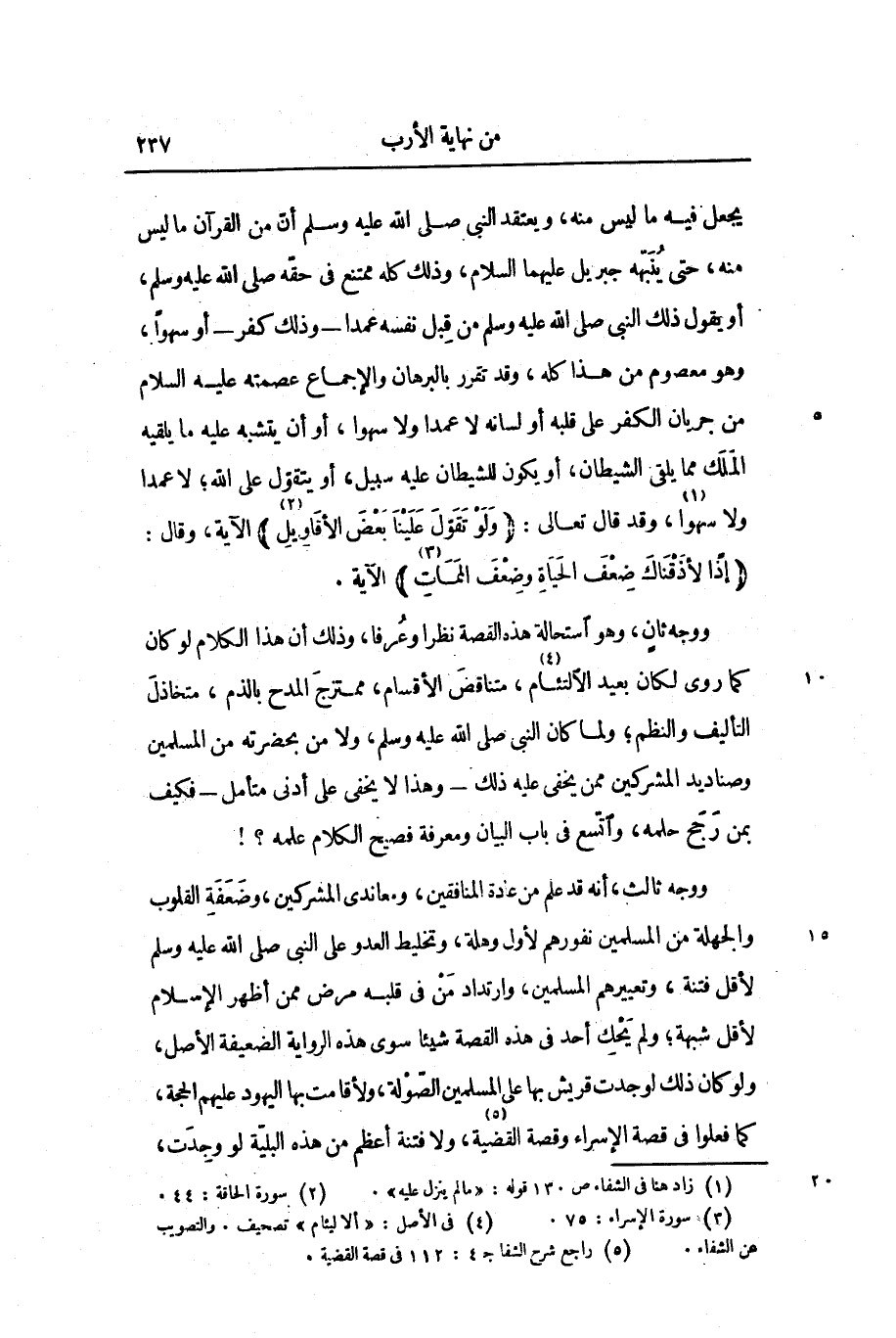 ووجه ثان، وهو استحالة هذه القصة نظرا وعرفا، وذلك أن هذا الكلام لو كان كما روى لكان بعيد الالتئام «4» ، متناقض الأقسام، ممتزج المدح بالذم، متخاذل التأليف والنظم؛ ولما كان النبى صلى الله عليه وسلم، ولا من بحضرته من المسلمين وصناديد المشركين ممن يخفى عليه ذلك- وهذا لا يخفى على أدنى متأمل- فكيف بمن رجح حلمه، واتّسع فى باب البيان ومعرفة فصيح الكلام علمه؟! ووجه ثالث، أنه قد علم من عادة المنافقين، ومعاندى المشركين، وضعفة القلوب والجهلة من المسلمين نفورهم لأول وهلة، وتخليط العدو على النبى صلى الله عليه وسلم لأقل فتنة، وتعييرهم المسلمين، وارتداد من فى قلبه مرض ممن أظهر الإسلام لأقل شبهة؛ ولم يحك أحد فى هذه القصة شيئا سوى هذه الرواية الضعيفة الأصل، ولو كان ذلك لوجدت قريش بها على المسلمين الصّولة، ولأقامت بها اليهود عليهم الحجة، كما فعلوا فى قصة الإسراء وقصة القضية «5» ، ولا فتنة أعظم من هذه البليّة لو وجدت،