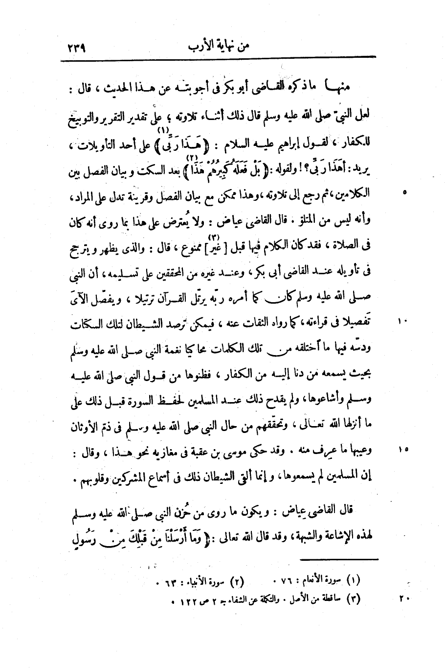 «2» بعد السكت وبيان الفصل بين الكلامين، ثم رجع إلى تلاوته، وهذا ممكن مع بيان الفصل وقرينة تدل على المراد، وأنه ليس من المتلوّ. قال القاضى عياض: ولا يعترض على هذا بما روى أنه كان فى الصلاة، فقد كان الكلام فيها قبل [غير «3» ] ممنوع، قال: والذى يظهر ويترجح فى تأويله عند القاضى أبى بكر، وعند غيره من المحققين على تسليمه، أن النبى صلى الله عليه وسلم كان كما أمره ربّه يرتّل القرآن ترتيلا، ويفصّل الآى تفصيلا فى قراءته، كما رواه الثقات عنه، فيمكن ترصد الشيطان لتلك السكتات ودسّه فيها ما اختلقه من تلك الكلمات محاكيا نغمة النبى صلى الله عليه وسلم بحيث يسمعه من دنا إليه من الكفار، فظنوها من قول النبى صلى الله عليه وسلم وأشاعوها، ولم يقدح ذلك عند المسلمين لحفظ السورة قبل ذلك على ما أنزلها الله تعالى، وتحقّقهم من حال النبى صلى الله عليه وسلم فى ذمّ الأوثان وعيبها ما عرف منه. وقد حكى موسى بن عقبة فى مغازيه نحو هذا، وقال: