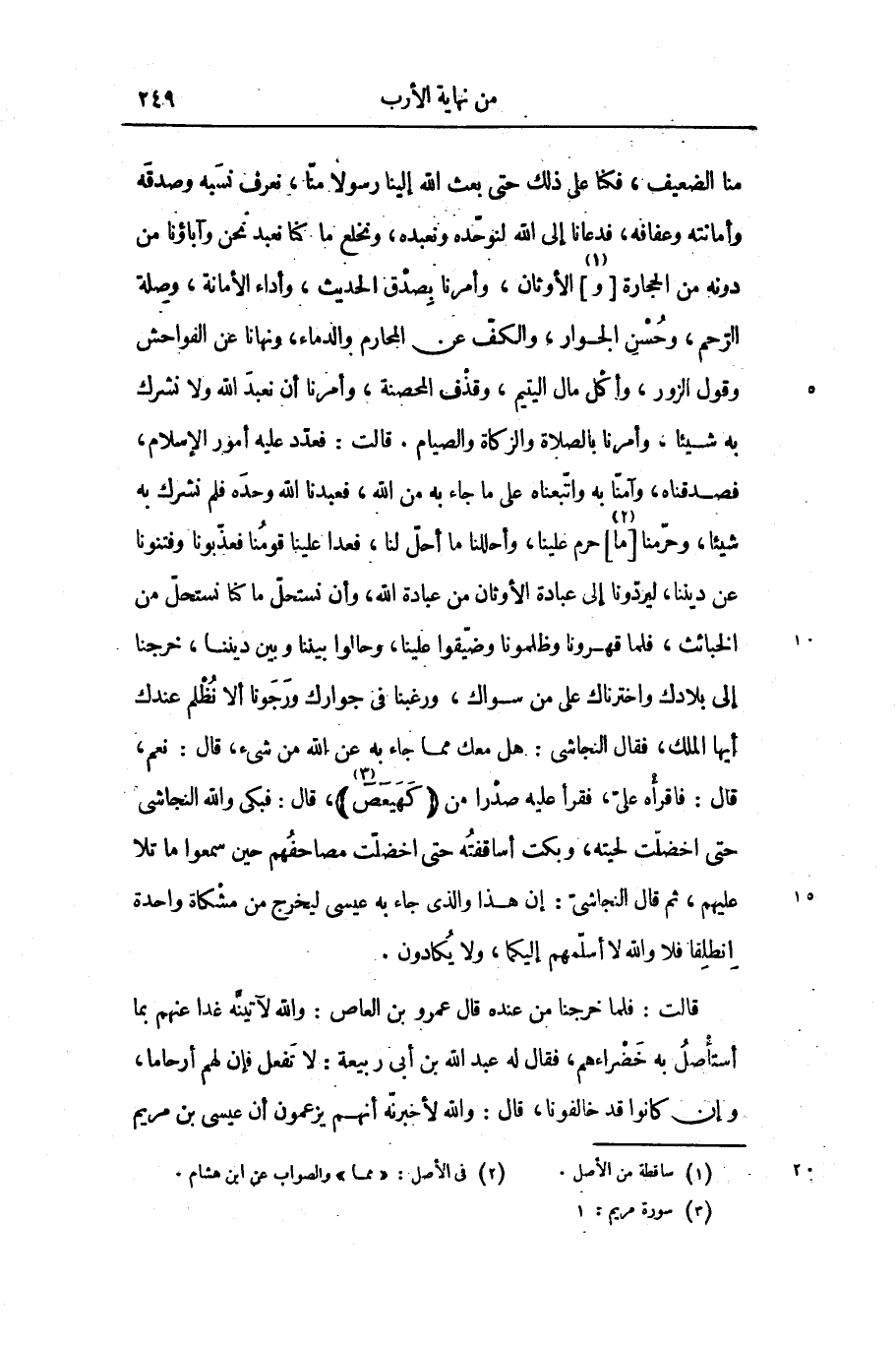 «3» ، قال: فبكى والله النجاشى حتى اخضلّت لحيته، وبكت أساقفته حتى اخضلّت مصاحفهم حين سمعوا ما تلا عليهم، ثم قال النجاشىّ: إن هذا والذى جاء به عيسى ليخرج من مشكاة واحدة انطلقا فلا والله لا أسلّمهم إليكما، ولا يكادون.