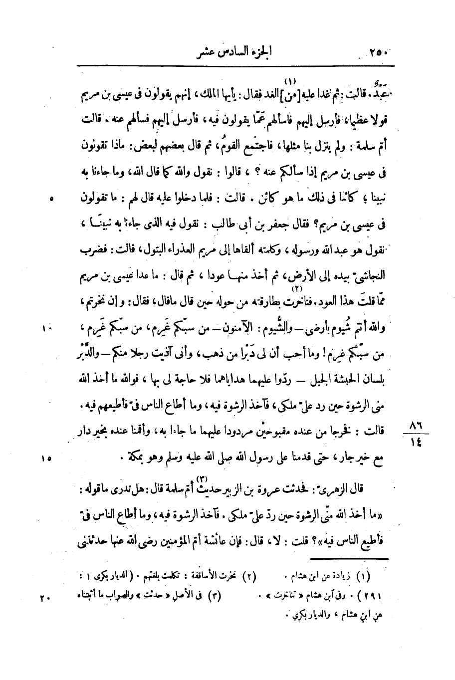عبد. قالت: ثم غدا عليه [من «1» ] الغد فقال: يأيها الملك، إنهم يقولون فى عيسى بن مريم قولا عظيما، فأرسل إليهم فاسألهم عمّا يقولون فيه، فأرسل إليهم فسألهم عنه. قالت أمّ سلمة: ولم ينزل بنا مثلها، فاجتمع القوم، ثم قال بعضهم لبعض: ماذا تقولون فى عيسى بن مريم إذا سألكم عنه؟، قالوا: نقول والله كما قال الله، وما جاءنا به نبينا؛ كائنا فى ذلك ما هو كائن. قالت: فلما دخلوا عليه قال لهم: ما تقولون فى عيسى بن مريم؟ فقال جعفر بن أبى طالب: نقول فيه الذى جاءنا به نبينا، نقول هو عبد الله ورسوله، وكلمته ألقاها إلى مريم العذراء البتول، قالت: فضرب النجاشىّ بيده إلى الأرض، ثم أخذ منها عودا، ثم قال: ما عدا عيسى بن مريم ممّا قلت هذا العود. فناخرت «2» بطارقته من حوله حين قال ما قال، فقال: وإن نخرتم، والله أنتم شيوم بأرضى- والشّيوم: الآمنون- من سبّكم غرم، من سبّكم غرم، من سبّكم غرم! وما أحب أن لى دبرا من ذهب، وأنى آذيت رجلا منكم- والدّبر بلسان الحبشة الجبل- ردّوا عليهما هداياهما فلا حاجة لى بها، فو الله ما أخذ الله منى الرشوة حين رد علىّ ملكى، فآخذ الرشوة فيه، وما أطاع الناس فىّ فأطيعهم فيه.