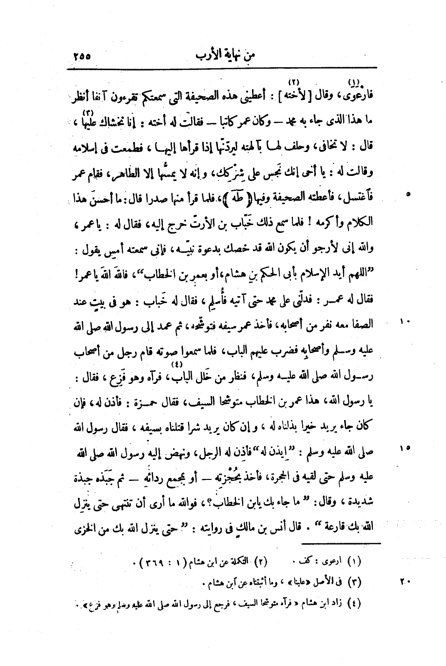 فارعوى «1» ، وقال [لأخته «2» ] : أعطينى هذه الصحيفة التى سمعتكم تقرءون آنفا أنظر ما هذا الذى جاء به محمد- وكان عمر كاتبا- فقالت له أخته: إنا نخشاك عليها «3» ، قال: لا تخافى، وحلف لها بآلهته ليردّنّها إذا قرأها إليها، فطمعت فى إسلامه وقالت له: يا أخى إنك نجس على شركك، وإنه لا يمسّها إلا الطاهر، فقام عمر فاغتسل، فأعطته الصحيفة وفيها (طه)