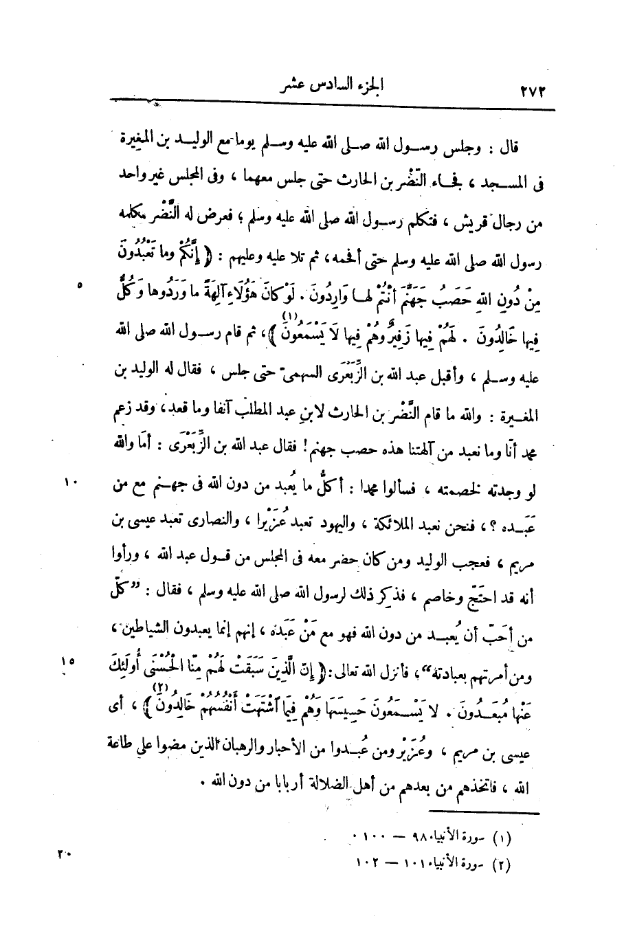 «1» ، ثم قام رسول الله صلى الله عليه وسلم، وأقبل عبد الله بن الزّبعرى السهمىّ حتى جلس، فقال له الوليد بن المغيرة: والله ما قام النّضر بن الحارث لابن عبد المطلب آنفا وما قعد، وقد زعم محمد أنّا وما نعبد من آلهتنا هذه حصب جهنم! فقال عبد الله بن الزّبعرى: أما والله لو وجدته لخصمته، فسألوا محمدا: أكلّ ما يعبد من دون الله فى جهنم مع من عبده؟، فنحن نعبد الملائكة، واليهود تعبد عزيرا، والنصارى تعبد عيسى بن مريم، فعجب الوليد ومن كان حضر معه فى المجلس من قول عبد الله، ورأوا أنه قد احتجّ وخاصم، فذكر ذلك لرسول الله صلى الله عليه وسلم، فقال: «كلّ من أحبّ أن يعبد من دون الله فهو مع من عبده، إنهم إنما يعبدون الشياطين، ومن أمرتهم بعبادته» ، فأنزل الله تعالى: (إِنَّ الَّذِينَ سَبَقَتْ لَهُمْ مِنَّا الْحُسْنى أُولئِكَ عَنْها مُبْعَدُونَ. لا يَسْمَعُونَ حَسِيسَها وَهُمْ فِي مَا اشْتَهَتْ أَنْفُسُهُمْ خالِدُونَ)