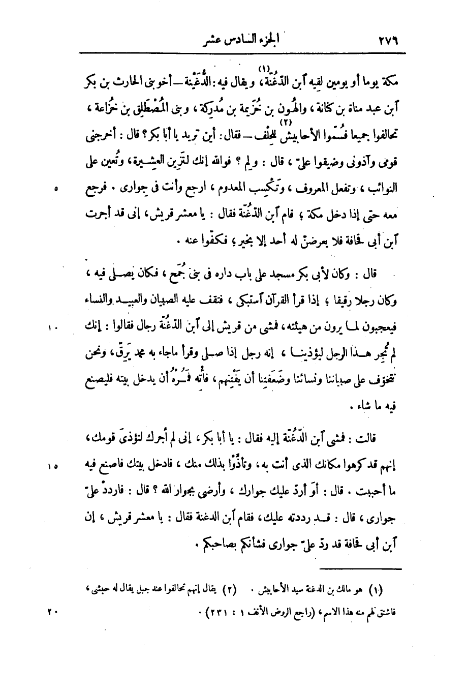 قالت: فمشى ابن الدّغنّة إليه فقال: يا أبا بكر، إنى لم أجرك لتؤذى قومك، إنهم قد كرهوا مكانك الذى أنت به، وتأذّوا بذلك منك، فادخل بيتك فاصنع فيه ما أحببت. قال: أو أردّ عليك جوارك، وأرضى بجوار الله؟ قال: فاردد علىّ جوارى، قال: قد رددته عليك، فقام ابن الدغنة فقال: يا معشر قريش، إن ابن أبى قحافة قد ردّ علىّ جوارى فشأنكم بصاحبكم.