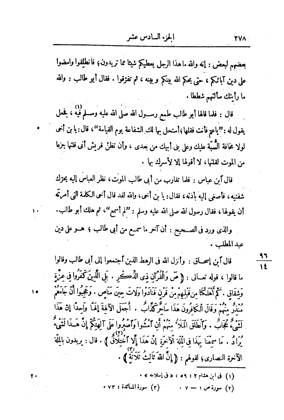 قال ابن إسحاق: وأنزل الله فى الرهط الذين اجتمعوا إلى أبى طالب وقالوا ما قالوا، قوله تعالى: (ص وَالْقُرْآنِ ذِي الذِّكْرِ. بَلِ الَّذِينَ كَفَرُوا فِي عِزَّةٍ وَشِقاقٍ. كَمْ أَهْلَكْنا مِنْ قَبْلِهِمْ مِنْ قَرْنٍ فَنادَوْا وَلاتَ حِينَ مَناصٍ. وَعَجِبُوا أَنْ جاءَهُمْ مُنْذِرٌ مِنْهُمْ وَقالَ الْكافِرُونَ هذا ساحِرٌ كَذَّابٌ. أَجَعَلَ الْآلِهَةَ إِلهاً واحِداً إِنَّ هذا لَشَيْءٌ عُجابٌ. وَانْطَلَقَ الْمَلَأُ مِنْهُمْ أَنِ امْشُوا وَاصْبِرُوا عَلى آلِهَتِكُمْ إِنَّ هذا لَشَيْءٌ يُرادُ. ما سَمِعْنا بِهذا فِي الْمِلَّةِ الْآخِرَةِ إِنْ هذا إِلَّا اخْتِلاقٌ)
