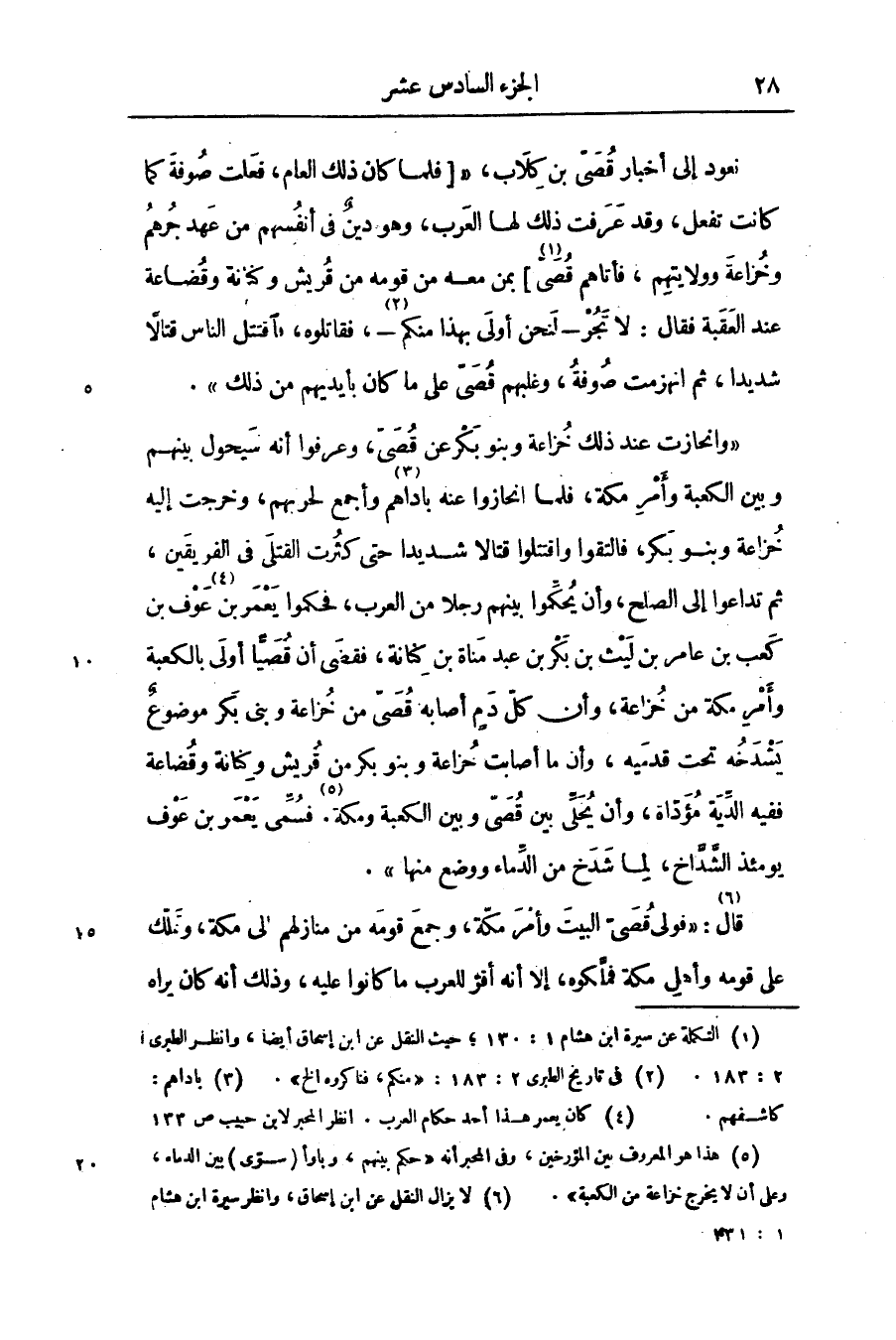 نعود إلى أخبار قصىّ بن كلاب، « [فلما كان ذلك العام، فعلت صوفة كما كانت تفعل، وقد عرفت ذلك لها العرب، وهو دين فى أنفسهم من عهد جرهم وخزاعة وولايتهم، فأتاهم قصىّ «1» ] بمن معه من قومه من قريش وكنانة وقضاعة عند العقبة فقال: لا تجر- لنحن أولى بهذا منكم «2» -، فقاتلوه، فاقتتل الناس قتالا شديدا، ثم انهزمت صوفة، وغلبهم قصىّ على ما كان بأيديهم من ذلك» .