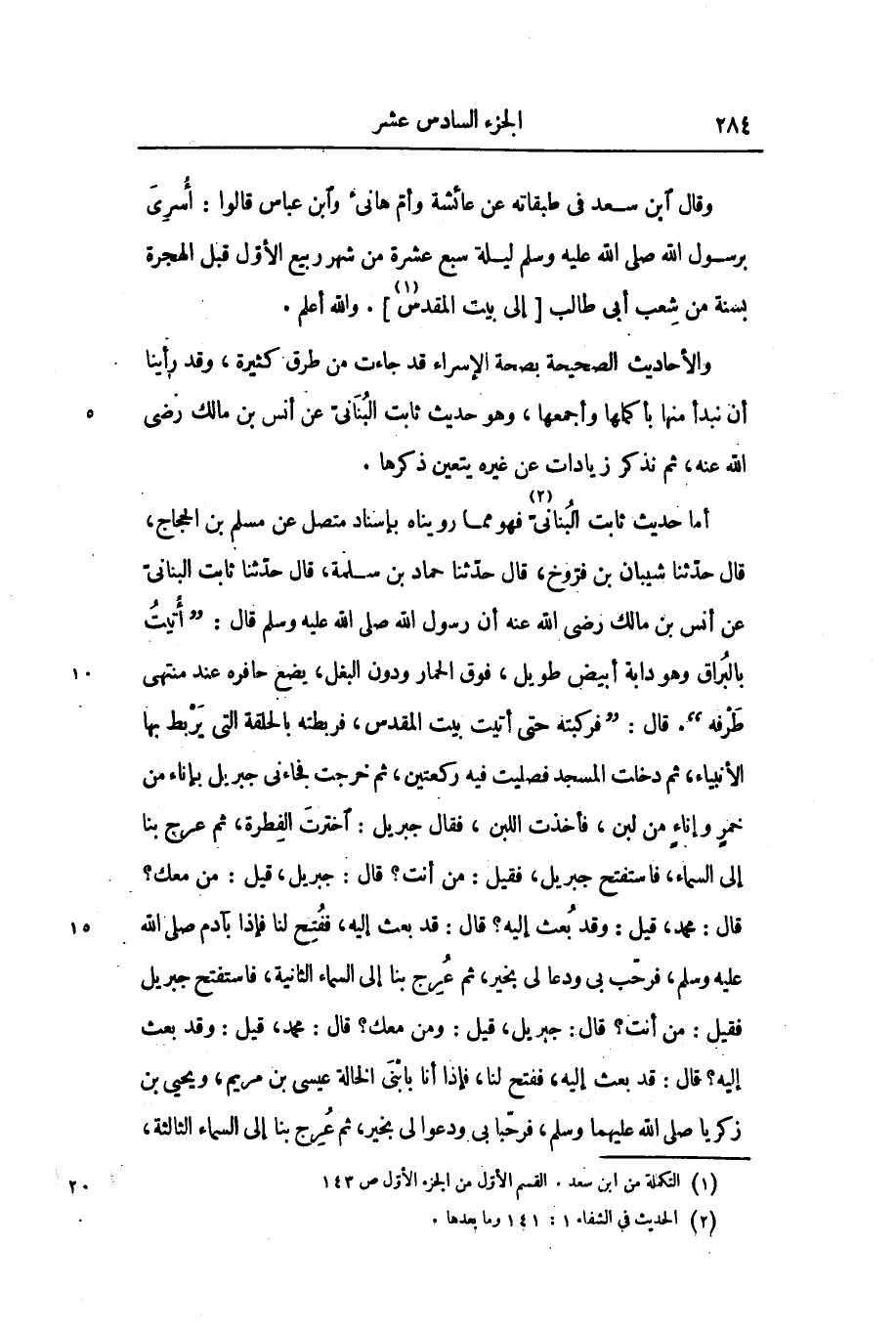 أما حديث ثابت البنانىّ «2» فهو مما رويناه بإسناد متصل عن مسلم بن الحجاج، قال حدّثنا شيبان بن فرّوخ، قال حدّثنا حماد بن سلمة، قال حدّثنا ثابت البنانىّ عن أنس بن مالك رضى الله عنه أن رسول الله صلى الله عليه وسلم قال: «أتيت بالبراق وهو دابة أبيض طويل، فوق الحمار ودون البغل، يضع حافره عند منتهى طرفه» . قال: «فركبته حتى أتيت بيت المقدس، فربطته بالحلقة التى يربط بها الأنبياء، ثم دخلت المسجد فصليت فيه ركعتين، ثم خرجت فجاءنى جبريل بإناء من خمر وإناء من لبن، فأخذت اللبن، فقال جبريل: اخترت الفطرة، ثم عرج بنا إلى السّماء، فاستفتح جبريل، فقيل: من أنت؟ قال: جبريل، قيل: من معك؟