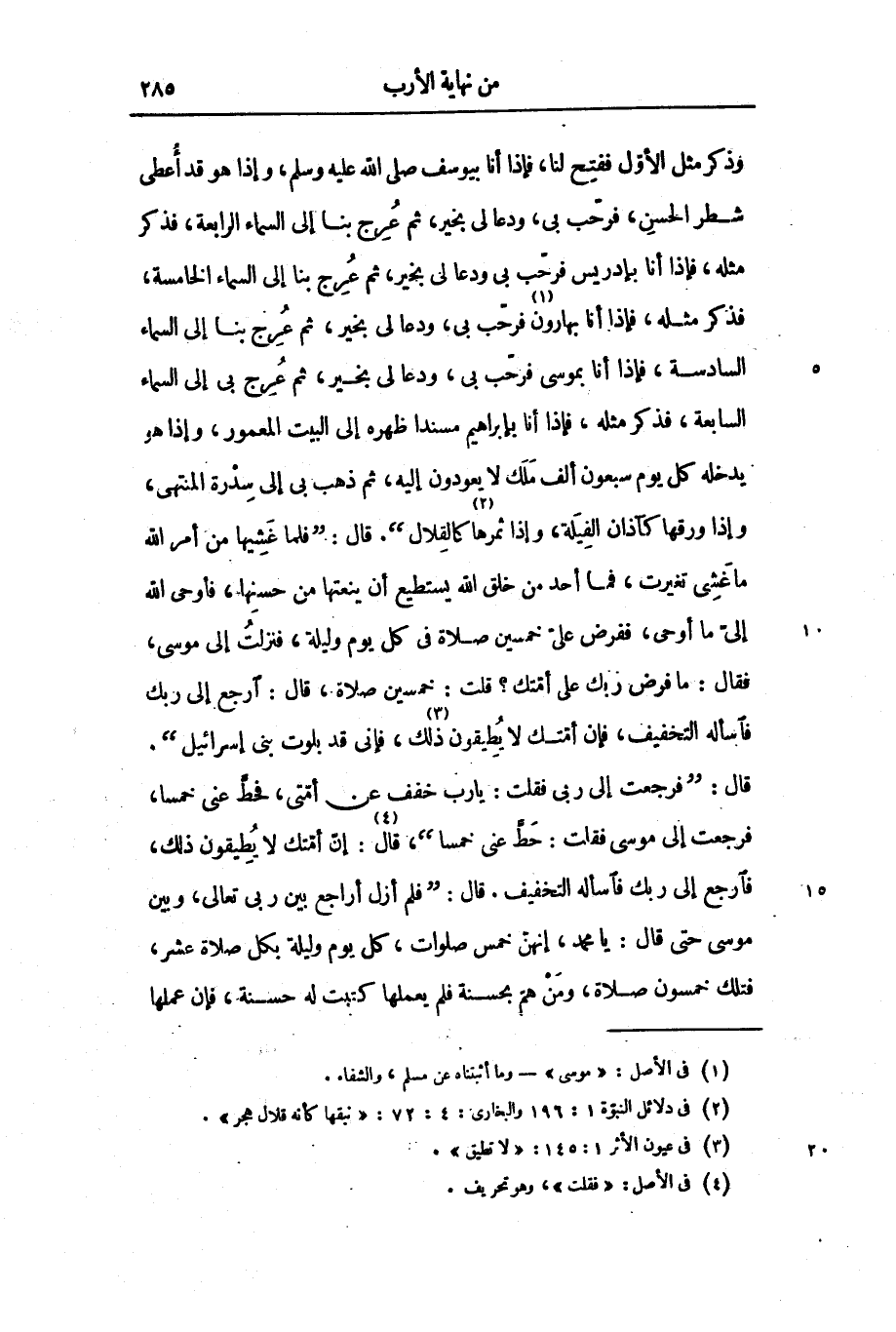 وذكر مثل الأوّل ففتح لنا، فإذا أنا بيوسف صلى الله عليه وسلم، وإذا هو قد أعطى شطر الحسن، فرحّب بى، ودعا لى بخير، ثم عرج بنا إلى السماء الرابعة، فذكر مثله، فإذا أنا بإدريس فرحّب بى ودعا لى بخير، ثم عرج بنا إلى السماء الخامسة، فذكر مثله، فإذا أنا بهارون «1» فرحّب بى، ودعا لى بخير، ثم عرج بى إلى السماء السادسة، فإذا أنا بموسى فرحّب بى، ودعا لى بخير، ثم عرج بى إلى السماء السابعة، فذكر مثله، فإذا أنا بإبراهيم مسندا ظهره إلى البيت المعمور، وإذا هو يدخله كل يوم سبعون ألف ملك لا يعودون إليه، ثم ذهب بى إلى سدرة المنتهى، وإذا ورقها كآذان الفيلة، وإذا ثمرها «2» كالقلال» . قال: «فلما غشيها من أمر الله ما غشى تغيرت، فما أحد من خلق الله يستطيع أن ينعتها من حسنها، فأوحى الله إلىّ ما أوحى، ففرض علىّ خمسين صلاة فى كل يوم وليلة، فنزلت إلى موسى، فقال: ما فرض ربك على أمّتك؟ قلت: خمسين صلاة، قال: ارجع إلى ربك فاسأله التخفيف، فإن أمّتك لا يطيقون ذلك «3» ، فإنى قد بلوت بنى إسرائيل» .
