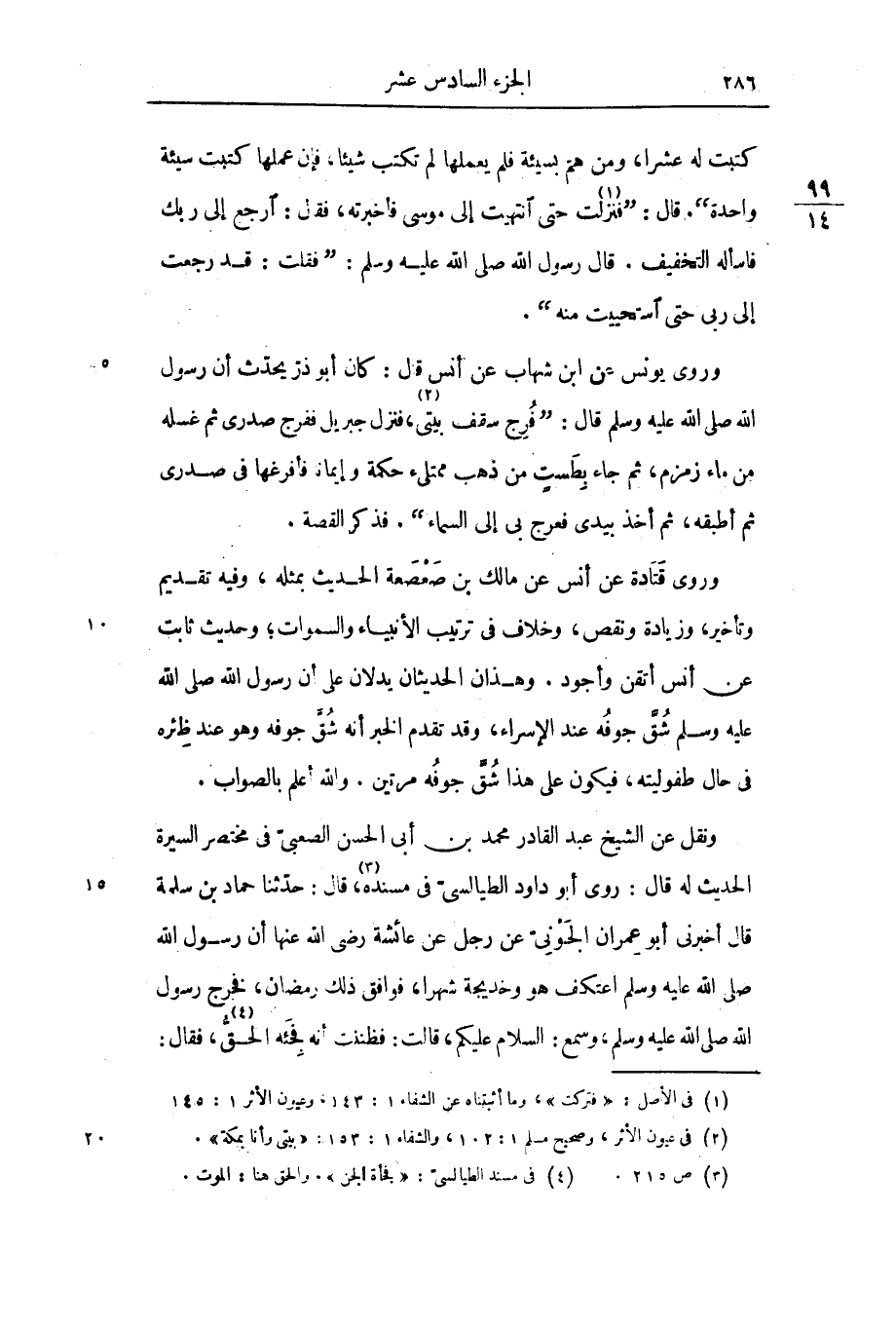 وروى قتادة عن أنس عن مالك بن صعصعة الحديث بمثله، وفيه تقديم وتأخير، وزيادة ونقص، وخلاف فى ترتيب الأنبياء والسموات؛ وحديث ثابت عن أنس أتقن وأجود. وهذان الحديثان يدلان على أن رسول الله صلى الله عليه وسلم شقّ جوفه عند الإسراء، وقد تقدم الخبر أنه شقّ جوفه وهو عند ظئره فى حال طفوليته، فيكون على هذا شقّ جوفه مرتين. والله أعلم بالصواب.