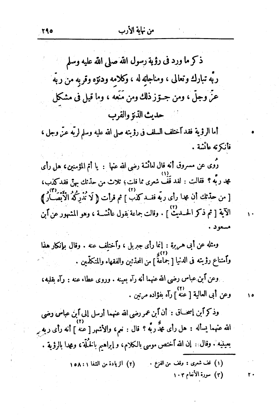 ذكر ما ورد فى رؤية رسول الله صلى الله عليه وسلم ربّه تبارك وتعالى، ومناجاته له، وكلامه ودنوّه وقربه من ربّه عزّ وجلّ، ومن جوّز ذلك ومن منعه، وما قيل فى مشكل حديث الدّنوّ والقرب