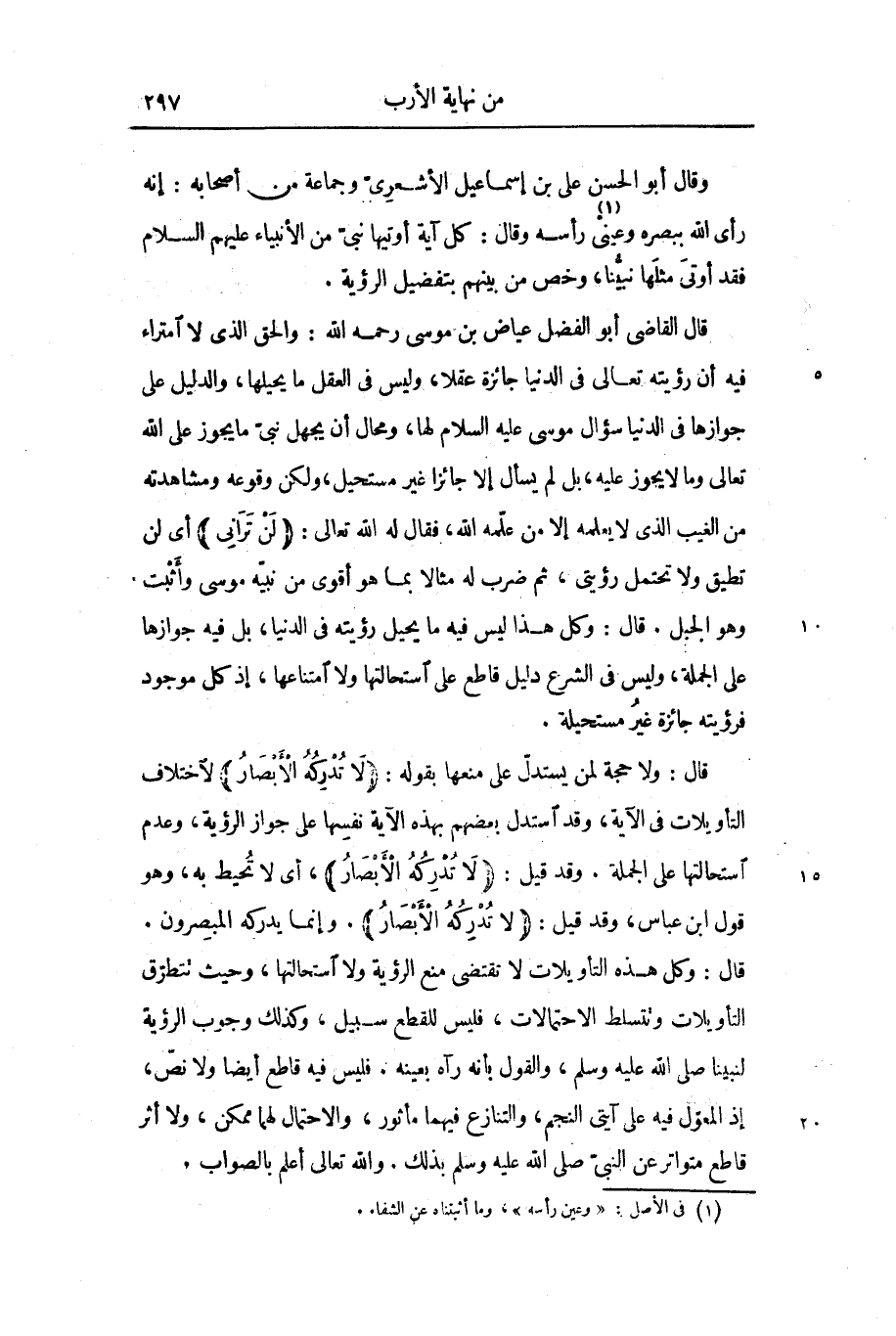 قال: وكل هذه التأويلات لا تقتضى منع الرؤية ولا استحالتها، وحيث تتطرّق التأويلات وتتسلط الاحتمالات، فليس للقطع سبيل، وكذلك وجوب الرؤية لنبينا صلى الله عليه وسلم، والقول بأنه رآه بعينه. فليس فيه قاطع أيضا ولا نصّ، إذ المعوّل فيه على آيتى النجم، والتنازع فيهما مأثور، والاحتمال لهما ممكن، ولا أثر قاطع متواتر عن النبىّ صلى الله عليه وسلم بذلك. والله تعالى أعلم بالصواب.