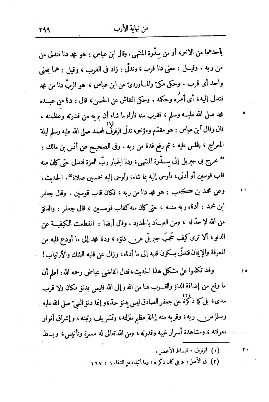 وعن محمد بن كعب: هو محمد دنا من ربه، فكان قاب قوسين. وقال جعفر ابن محمد: أدناه ربه منه، حتى كان منه كقاب قوسين، قال جعفر: والدنوّ من الله لا حدّ له، ومن العباد بالحدود. وقال أيضا: انقطعت الكيفية عن الدنو، ألا ترى كيف حجب جبريل عن دنوّه، ودنا محمد إلى ما أودع قلبه من المعرفة والإيمان فتدلّى بسكون قلبه إلى ما أدناه، وزال عن قلبه الشك والارتياب! وقد تكلموا على مشكل هذا الحديث، فقال القاضى عياض رحمه الله: اعلم أن ما وقع من إضافة الدنوّ والقرب هنا من الله وإلى الله فليس بدنوّ مكان ولا قرب مدى، بل كما ذكرنا «2» عن جعفر الصادق ليس بدنوّ حدّ، وإنما دنوّ النبىّ صلى الله عليه وسلم من ربه، وقربه منه إبانة عظيم منزلته، وتشريف رتبته، وإشراق أنوار معرفته، ومشاهدة أسرار غيبه وقدرته، ومن الله تعالى له مسرة وتأنيس، وبسط