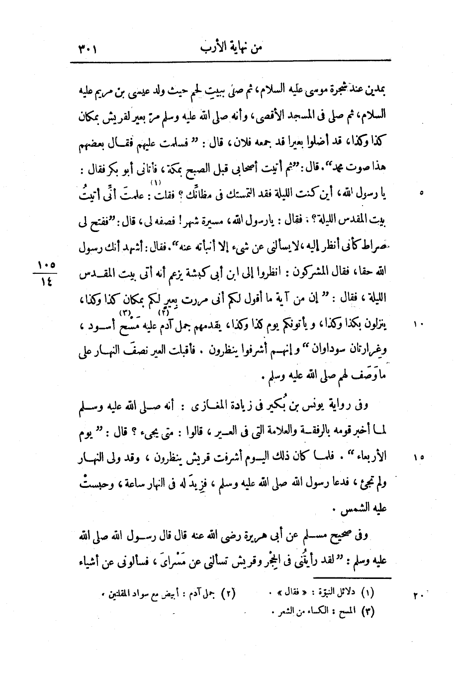 بمدين عند شجرة موسى عليه السلام، ثم صلى ببيت لحم حيث ولد عيسى بن مريم عليه السلام، ثم صلى فى المسجد الأقصى، وأنه صلى الله عليه وسلم مرّ بعير لقريش بمكان كذا وكذا، قد أضلوا بعيرا قد جمعه فلان، قال: «فسلمت عليهم فقال بعضهم هذا صوت محمد» . قال: «ثم أتيت أصحابى قبل الصبح بمكة، فأتانى أبو بكر فقال: