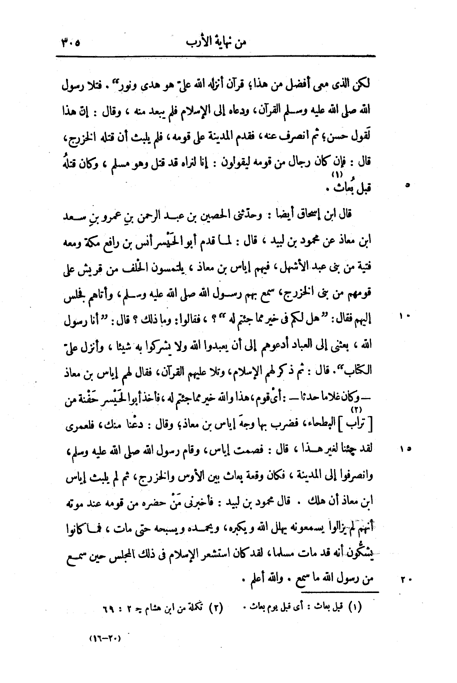 لكن الذى معى أفضل من هذا؛ قرآن أنزله الله علىّ هو هدى ونور» . فتلا رسول الله صلى الله عليه وسلم القرآن، ودعاه إلى الإسلام فلم يبعد منه، وقال: إنّ هذا لقول حسن؛ ثم انصرف عنه، فقدم المدينة على قومه، فلم يلبث أن قتله الخزرج، قال: فإن كان رجال من قومه ليقولون: إنا لنراه قد قتل وهو مسلم، وكان قتله قبل بعاث «1» .