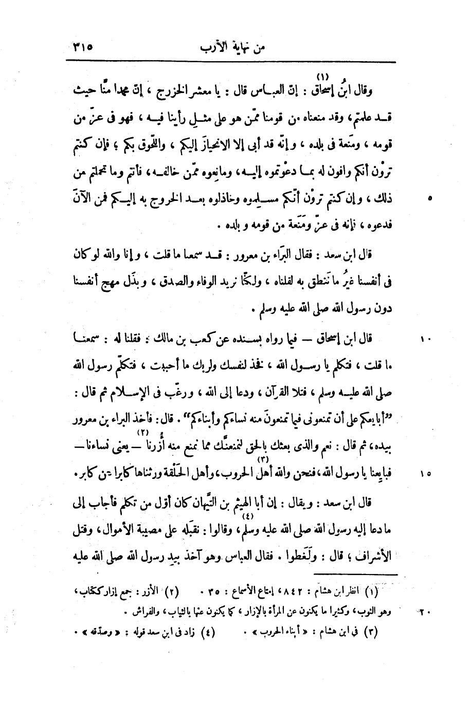 وقال ابن إسحاق: «1» إنّ العباس قال: يا معشر الخزرج، إنّ محمدا منّا حيث قد علمتم، وقد منعناه من قومنا ممّن هو على مثل رأينا فيه، فهو فى عزّ من قومه، ومنعة فى بلده، وإنّه قد أبى إلا الانحياز إليكم، واللّحوق بكم؛ فإن كنتم ترون أنكم وافون له بما دعوتموه إليه، ومانعوه ممّن خالفه، فأنتم وما تحملتم من ذلك، وإن كنتم ترون أنّكم مسلموه وخاذلوه بعد الخروج به إليكم فمن الآن فدعوه، فإنه فى عزّ ومنعة من قومه وبلده.