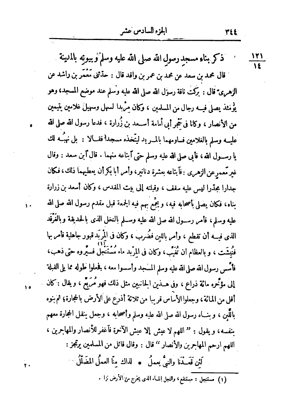 قال محمد بن سعد عن محمد بن عمر بن واقد قال: حدّثنى معمر بن راشد عن الزهرىّ قال: بركت ناقة رسول الله صلى الله عليه وسلم عند موضع المسجد، وهو يومئذ يصلى فيه رجال من المسلمين، وكان مربدا لسهل وسهيل غلامين يتيمين من الأنصار، وكانا فى حجر أبى أمامة أسعد بن زرارة، فدعا رسول الله صلى الله عليه وسلم بالغلامين فساومهما بالمربد ليتّخذه مسجدا فقالا: بل نهبه لك يا رسول الله، فأبى صلى الله عليه وسلم حتى ابتاعه منهما. قال ابن سعد: وقال غير معمر عن الزهرى: فابتاعه بعشرة دنانير، وأمر أبا بكر أن يعطيهما ذلك، فكان جدارا مجدّرا ليس عليه سقف، وقبلته إلى بيت المقدس، وكان أسعد بن زرارة بناه، فكان يصلى بأصحابه فيه، ويجمّع بهم فيه الجمعة قبل مقدم رسول الله صلى الله عليه وسلم، فأمر رسول الله صلى الله عليه وسلم بالنخل الذى بالحديقة وبالغرقد الذى فيه أن تقطع، وأمر باللبن فضرب، وكان فى المربد قبور جاهلية فأمر بها فنبشت، وبالعظام أن تغيّب، وكان فى المربد ماء مستنجل «1» فسيّروه حتى ذهب، فأسّس رسول الله صلى الله عليه وسلم المسجد وأسسوا معه، فجعلوا طوله مما يلى القبلة إلى مؤخّره مائة ذراع، وفى هذين الجانبين مثل ذلك فهو مربّع، ويقال: كان أقل من المائة، وجعلوا الأساس قريبا من ثلاثة أذرع على الأرض بالحجارة؛ ثم بنوه باللّبن، وبناه رسول الله صلى الله عليه وسلم وأصحابه، وجعل ينقل الحجارة معهم بنفسه، ويقول: «اللهم لا عيش إلا عيش الآخرة فاغفر للأنصار والمهاجرين، اللهم ارحم المهاجرين والأنصار» قال: وقال قائل من المسلمين يرتجز: