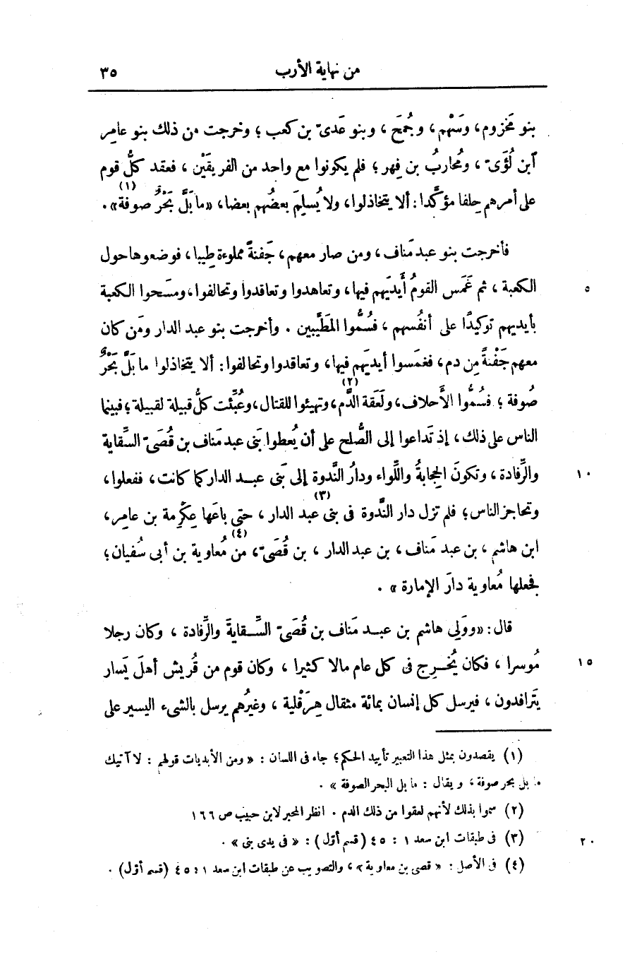 فأخرجت بنو عبد مناف، ومن صار معهم، جفنة مملوءة طيبا، فوضعوها حول الكعبة، ثم غمس القوم أيديهم فيها، وتعاهدوا وتعاقدوا وتحالفوا، ومسحوا الكعبة بأيديهم توكيدا على أنفسهم، فسمّوا المطيّبين. وأخرجت بنو عبد الدار ومن كان معهم جفنة من دم، فغمسوا أيديهم فيها، وتعاقدوا وتحالفوا: ألا يتخاذلوا ما بلّ بحر صوفة؛ فسمّوا الأحلاف، ولعقة الدّم «2» ، وتهيئوا للقتال، وعبّئت كلّ قبيلة؛ فبينما الناس على ذلك، إذ تداعوا إلى الصّلح على أن يعطوا بنى عبد مناف بن قصىّ السّقاية والرّفادة، وتكون الحجابة واللّواء ودار النّدوة إلى بنى عبد الدار كما كانت، ففعلوا، وتحاجز الناس؛ فلم تزل دار النّدوة فى بنى «3» عبد الدار، حتى باعها عكرمة بن عامر، ابن هاشم، بن عبد مناف، بن عبد الدار، بن قصىّ، من «4» معاوية بن أبى سفيان؛ فجعلها معاوية دار الإمارة» .