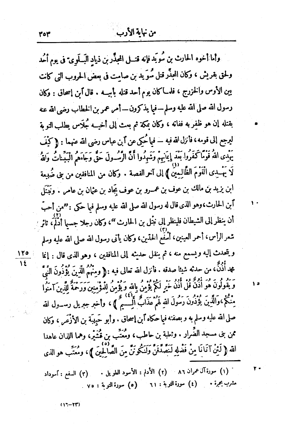 وأما أخوه الحارث بن سويد فإنه قتل المجذّر بن ذياد البلوىّ فى يوم أحد ولحق بقريش، وكان المجذّر قتل سويد بن صامت فى بعض الحروب التى كانت بين الأوس والخزرج، فلما كان يوم أحد قتله بأبيه. قال ابن إسحاق: وكان رسول الله صلى الله عليه وسلم- فيما يذكرون- أمر عمر بن الخطاب رضى الله عنه بقتله إن هو ظفر به ففاته، وكان بمكة ثم بعث إلى أخيه جلاس يطلب التوبة ليرجع إلى قومه، فأنزل الله فيه- فيما حكى عن ابن عباس رضى الله عنهما: (كَيْفَ يَهْدِي اللَّهُ قَوْماً كَفَرُوا بَعْدَ إِيمانِهِمْ وَشَهِدُوا أَنَّ الرَّسُولَ حَقٌّ وَجاءَهُمُ الْبَيِّناتُ وَاللَّهُ لا يَهْدِي الْقَوْمَ الظَّالِمِينَ)