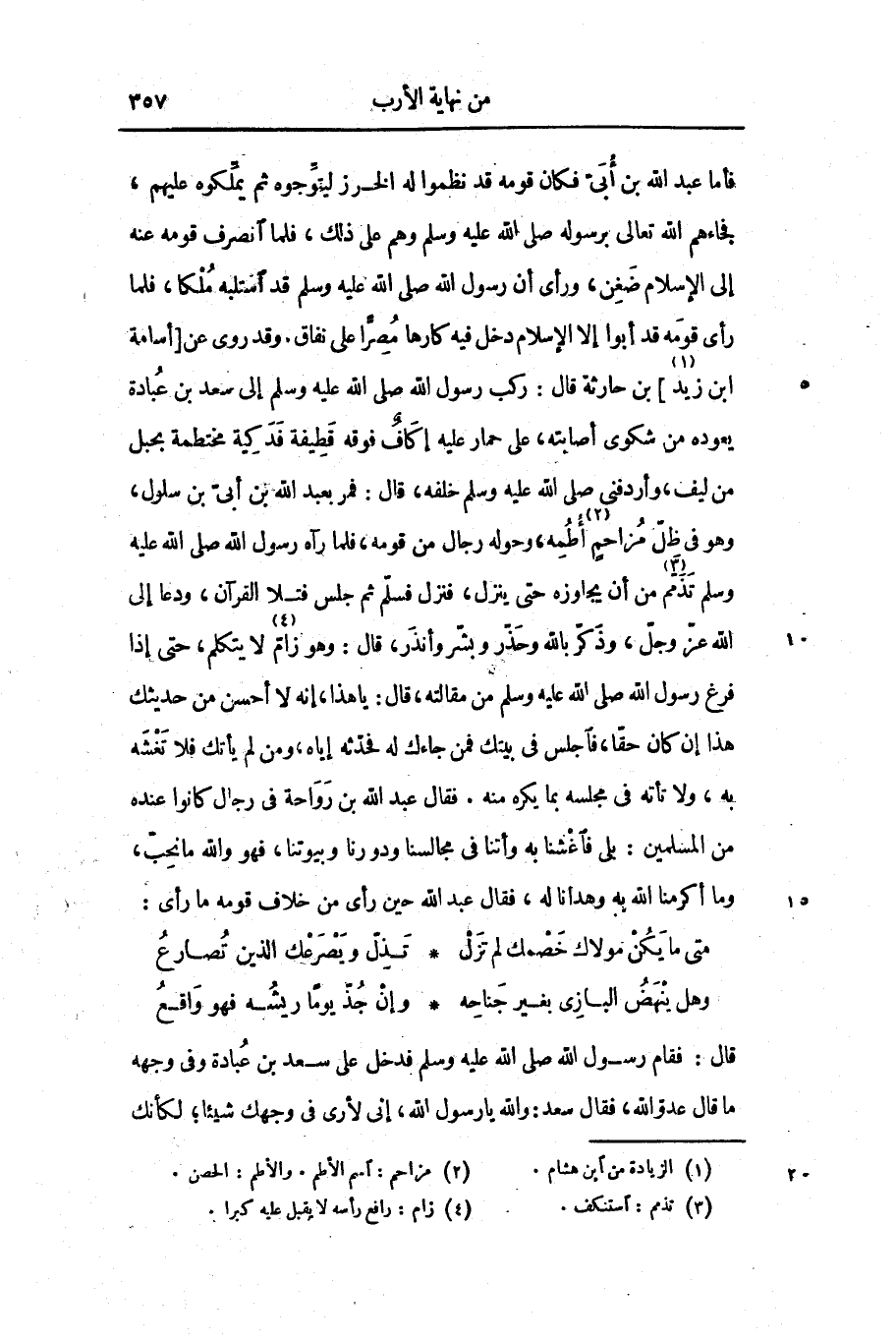 فأما عبد الله بن أبىّ فكان قومه قد نظموا له الخرز ليتوّجوه ثم يملّكوه عليهم، فجاءهم الله تعالى برسوله صلى الله عليه وسلم وهم على ذلك، فلما انصرف قومه عنه إلى الإسلام ضغن، ورأى أن رسول الله صلى الله عليه وسلم قد استلبه ملكا، فلما رأى قومه قد أبوا إلا الإسلام دخل فيه كارها مصرّا على نفاق. وقد روى عن [أسامة ابن زيد «1» ] بن حارثة قال: ركب رسول الله صلى الله عليه وسلم إلى سعد بن عبادة يعوده من شكوى أصابته، على حمار عليه إكاف فوقه قطيفة فدكية مختطمة بحبل من ليف، وأردفنى صلى الله عليه وسلم خلفه، قال: فمر بعبد الله بن أبىّ بن سلول، وهو فى ظلّ مزاحم «2» أطمه، وحوله رجال من قومه، فلما رآه رسول الله صلى الله عليه وسلم تذمّم «3» من أن يجاوزه حتى ينزل، فنزل فسلّم ثم جلس فتلا القرآن، ودعا إلى الله عزّ وجلّ، وذكّر بالله وحذّر وبشّر وأنذر، قال: وهو زامّ «4» لا يتكلم، حتى إذا فرغ رسول الله صلى الله عليه وسلم من مقالته، قال: يا هذا، إنه لا أحسن من حديثك هذا إن كان حقّا، فاجلس فى بيتك فمن جاءك له فحدّثه إياه، ومن لم يأتك فلا تغشه به، ولا تأته فى مجلسه بما يكره منه. فقال عبد الله بن رواحة فى رجال كانوا عنده من المسلمين: بلى فاغشنا به وأتنا فى مجالسنا ودورنا وبيوتنا، فهو والله ما نحبّ، وما أكرمنا الله به وهدانا له، فقال عبد الله حين رأى من خلاف قومه ما رأى: